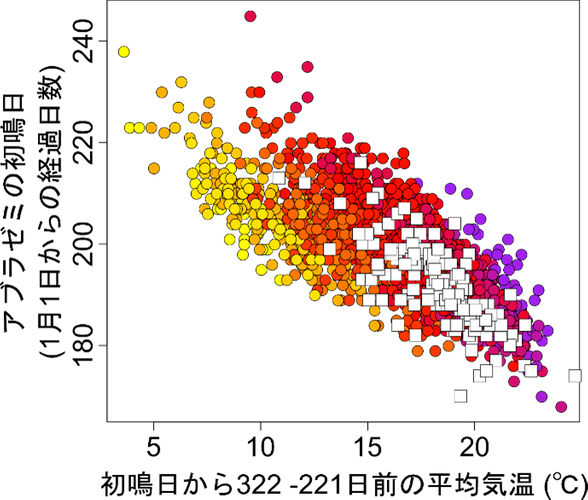 アブラゼミの初鳴き日から何日前・何日間の、どの気象要因が最もアブラゼミの初鳴き日の予測に効果を持つかについて、各調査地点に近い気象台で記録された日平均気温、日平均湿度、日平均風速、全天日射量、日降水量を使用し、1369通りの統計モデルを比較して、最も当てはまるモデルに使用されている期間の気象要因を探索的に分析しました。その結果、日射量、湿度、降雨、風速の効果は小さかったのに対し、気温の効果は顕著に大きいことがわかりました(図1)。特に、初鳴き日は322日前から221日前の気温と強い負の相関を持つことが明らかとなりました(図2)。すなわち、前の年の盛夏から初冬の気温が高いと、アブラゼミの初鳴き日が早まる傾向があることが示されました。