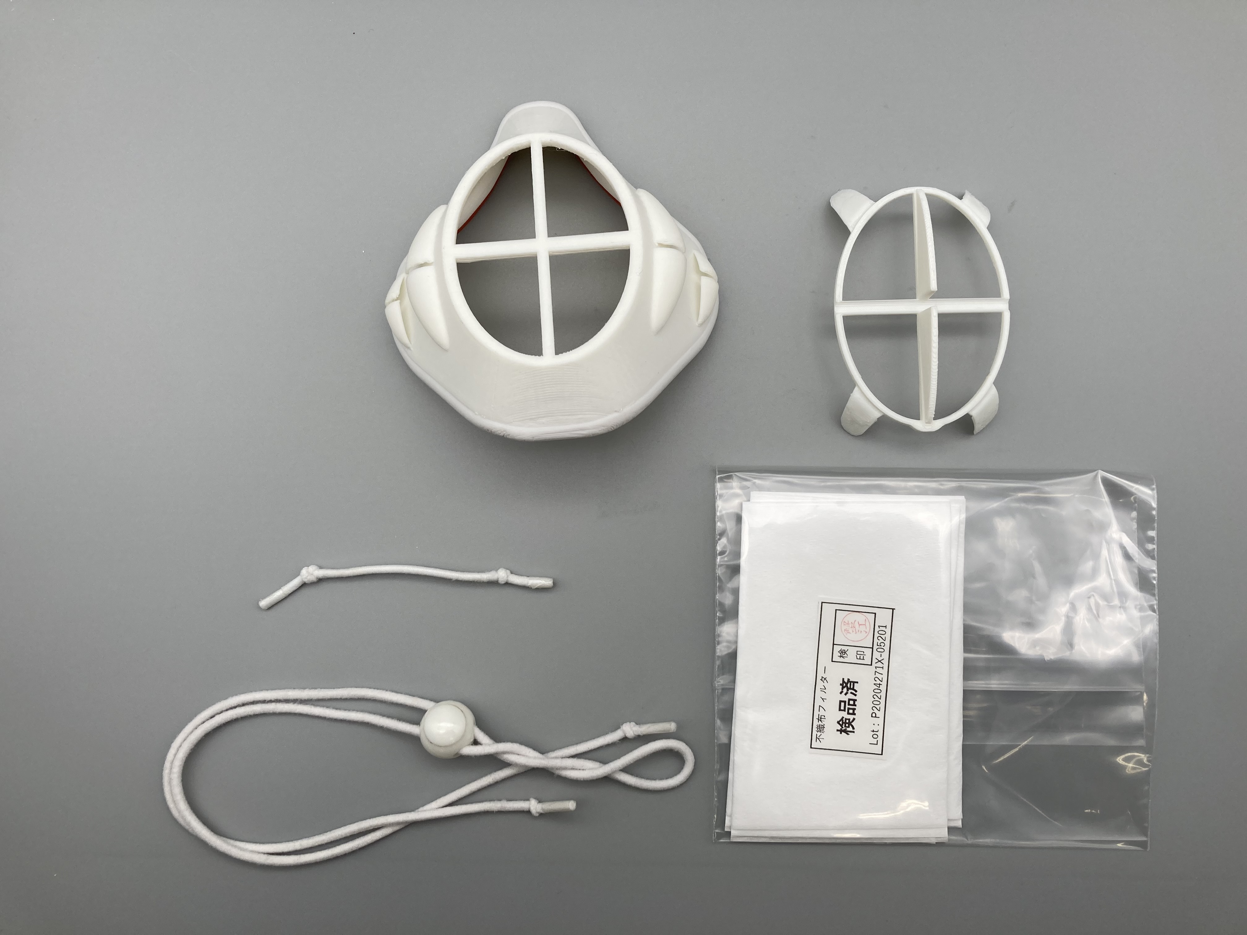 タートルは、本体が生分解性樹脂(PLA)で出来ており再使用が可能なうえ、使い捨てになる不織布の使用量も従来の使い捨て不織布のマスクの1/10で済むなど、環境にも配慮しています。