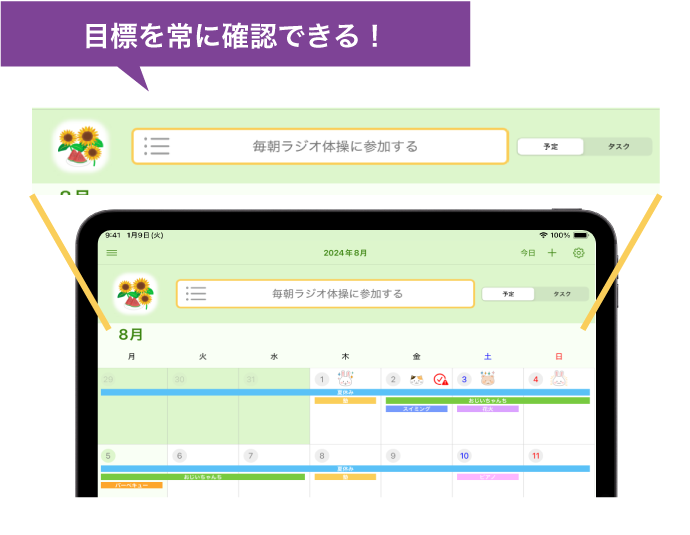 AC Calendarは、子どもたちが直感的に操作できる「はじめてのカレンダーアプリ」をコンセプトとした、予定・タスク・目標をまとめて簡単に管理できるアプリです。