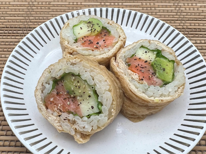 塩味の効いたスモークサーモンとモッツアレラチーズを酢飯とともにお揚げで巻き上げました。アボカドを和えて作った濃厚チーズソースは粗挽きのブラックペッパーをピリッとアクセントに洋風に仕上げた伊奈利ロールです!