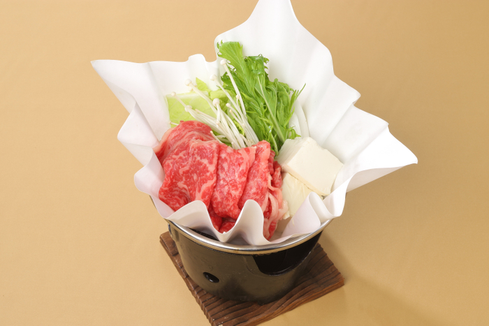 ランチメニュー(メイン:国産牛肉の紙鍋すき焼き風、ビュッフェメニュー、天ぷら盛り合わせ)
