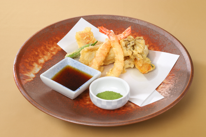 ランチタイムは、①国産牛肉の紙鍋すき焼き風 ②肉プレート ③天ぷら盛り合わせ ④魚プレートの4種のメイン料理から1種をお選びいただき、前菜やサラダ、デザートについてはビュッフェスタイルでお召し上がりいただけます。