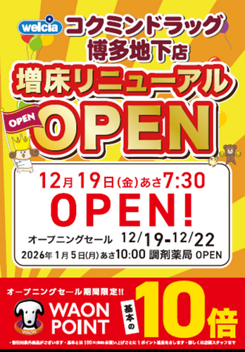 博多駅地下街の利便性がさらに向上! 「コクミンドラッグ」12/19(金)増床リニューアルオープン!