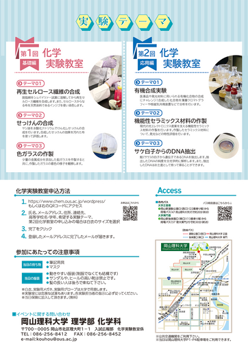 岡山理科大学理学部化学科では、今年度も化学実験教室を2回にわたり開催致します。
