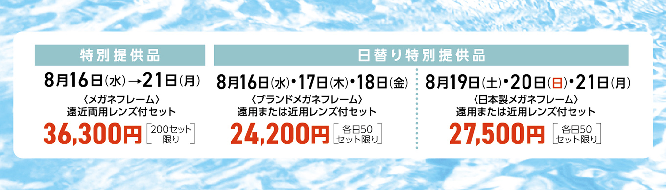 遠用または近用レンズ付セットは各日50セット限りでのご用意です。
