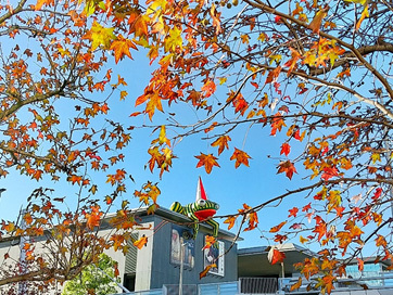 こちらの作品は、この青空を背景にして、色づいたミュージアムロードの街路樹が、絵画の額のように、我らがアイドル“美かえる”の周囲を彩っています。