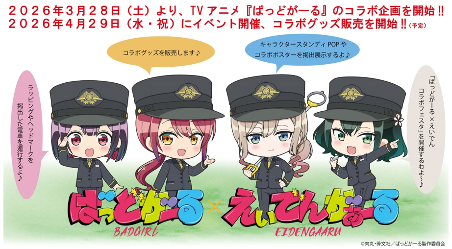 叡山電鉄株式会社(本社:京都市左京区、代表取締役社長:豊田秀明)では、株式会社芳文社(所在地:東京都文京区、代表取締役社長:孝壽尚志)発行のまんが雑誌「まんがタイムきらら」とのコラボレーション企画「きらら×きららプロジェクト」の第43弾として、「ばっどがーる」(著者:肉丸)とのコラボレーション企画を2026年3月28日(土)より実施します。