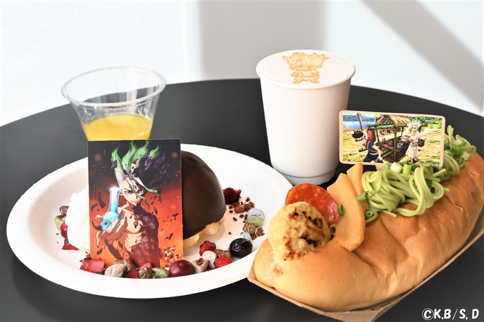 開催を記念して、本イベント限定のオリジナルフードとドリンクを販売することが決定。 「石化のデザートプレート 復活液付き」は、あの“復活液”をイメージしたオレンジソースをドーム型のチョコレートにかけると、中から甘いデザートが登場する、楽しいメニューとなっています。「ねこじゃらしラーメンパン」は、アニメで登場した“ねこじゃらしラーメン”をイメージしたコッペパン。醤油ベースのソースは、トッピングのお肉と相性抜群です。また、「Dr.STONE」のかわいいSDキャラクターが「ココアアート」として登場。6種類の中から好きなキャラクターをお選びいただけます。