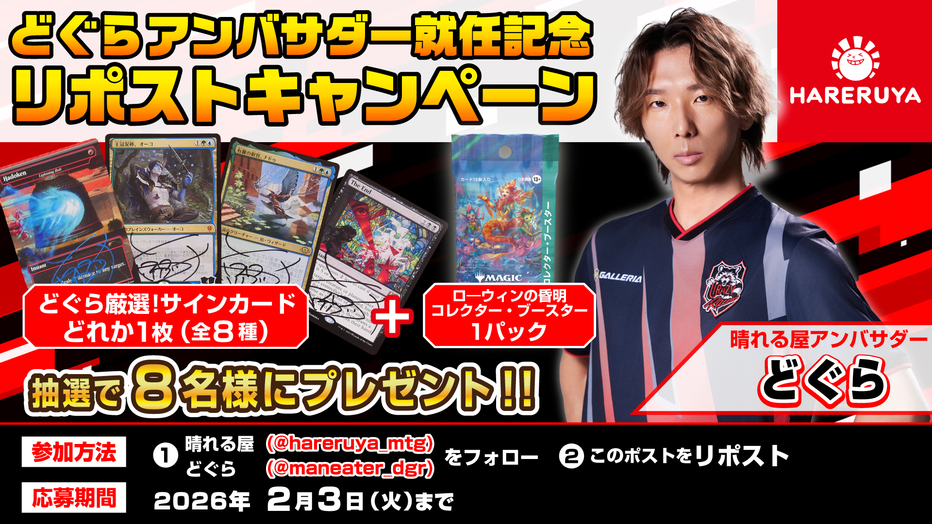 また、どぐら選手のアンバサダー就任を記念して、抽選で8名様に『どぐら厳選サインカード1枚』+《ローウィンの昏明》コレクター・ブースター日本語版1パックをプレゼントする、Xフォロー&リポストキャンペーンを開催中です。
