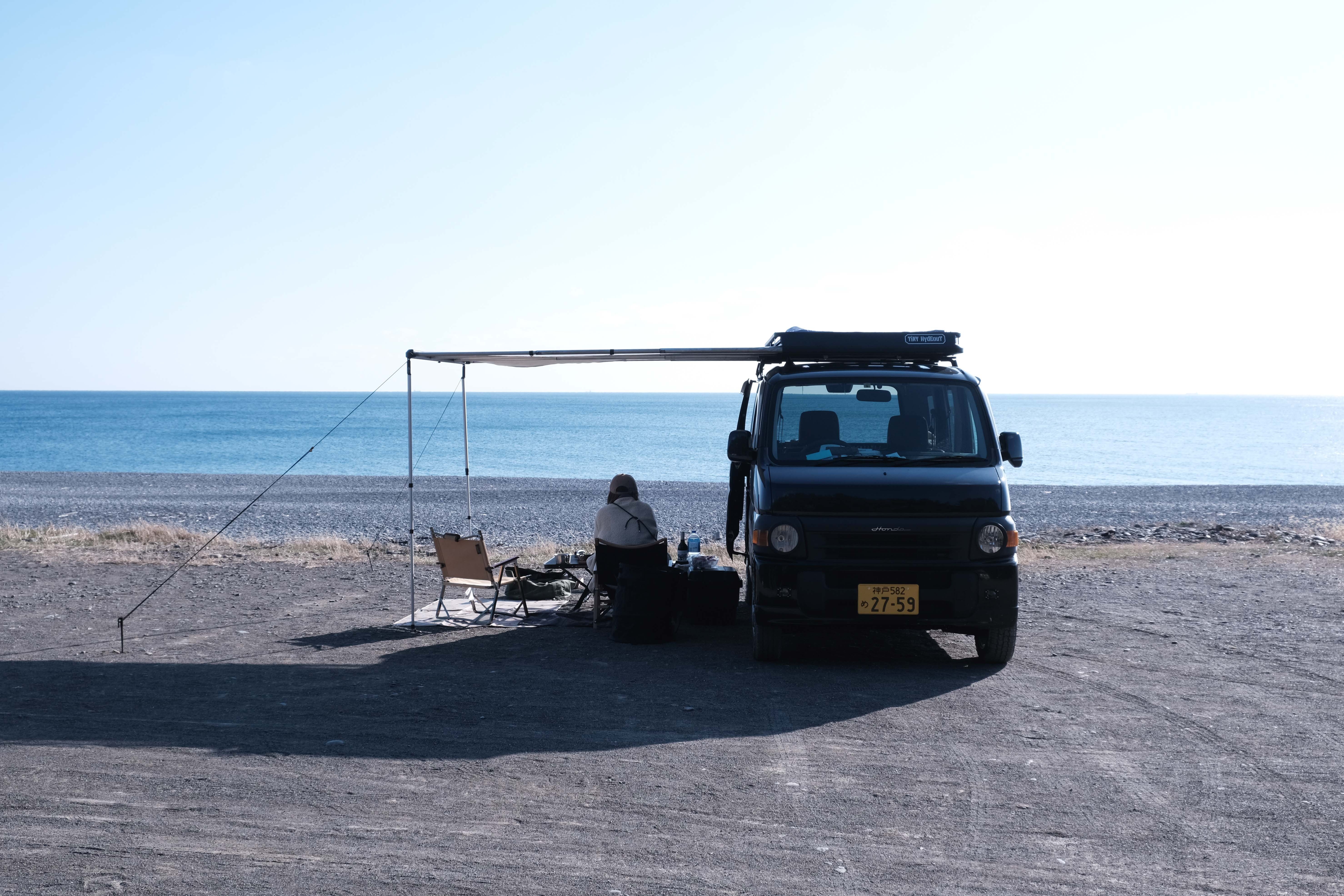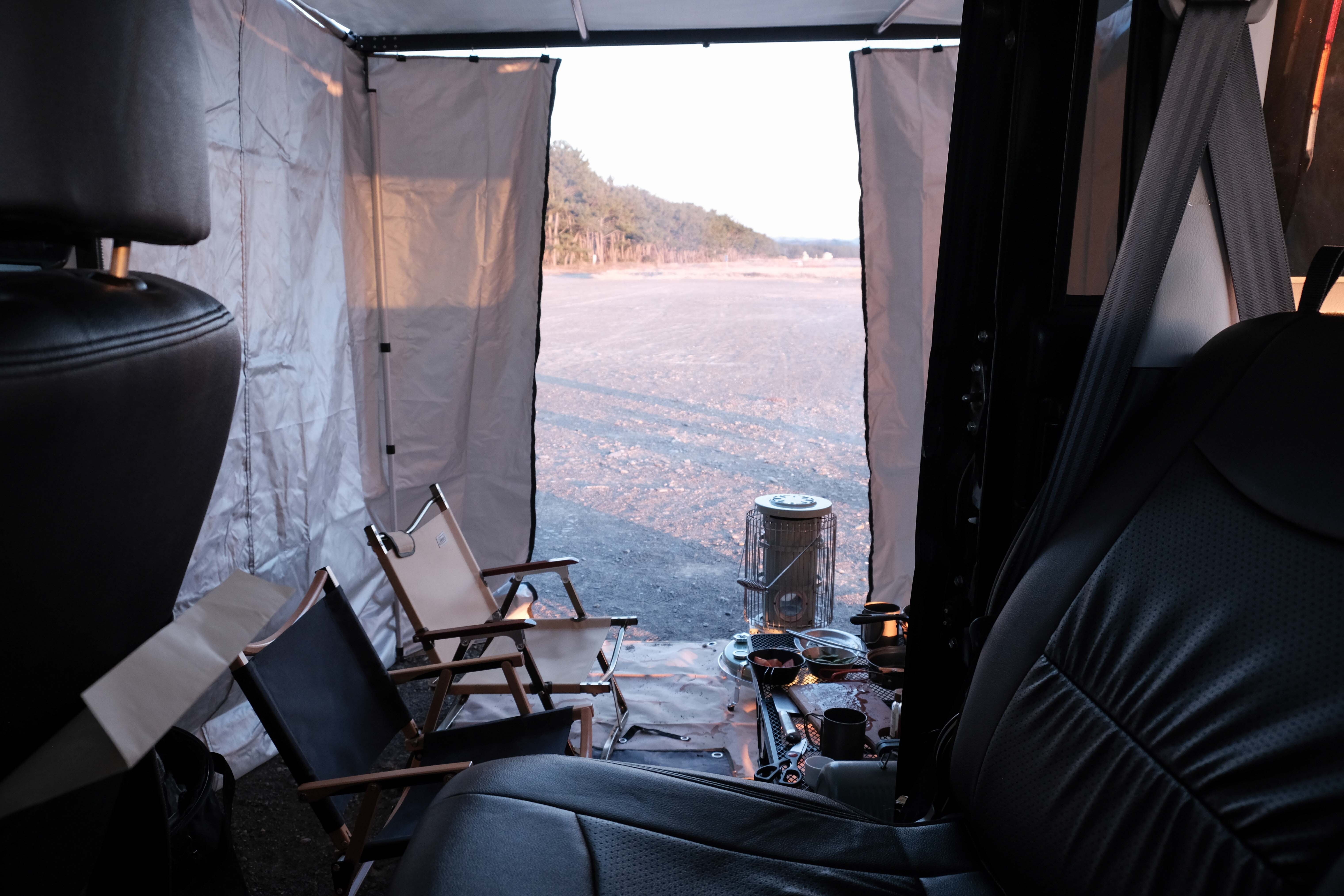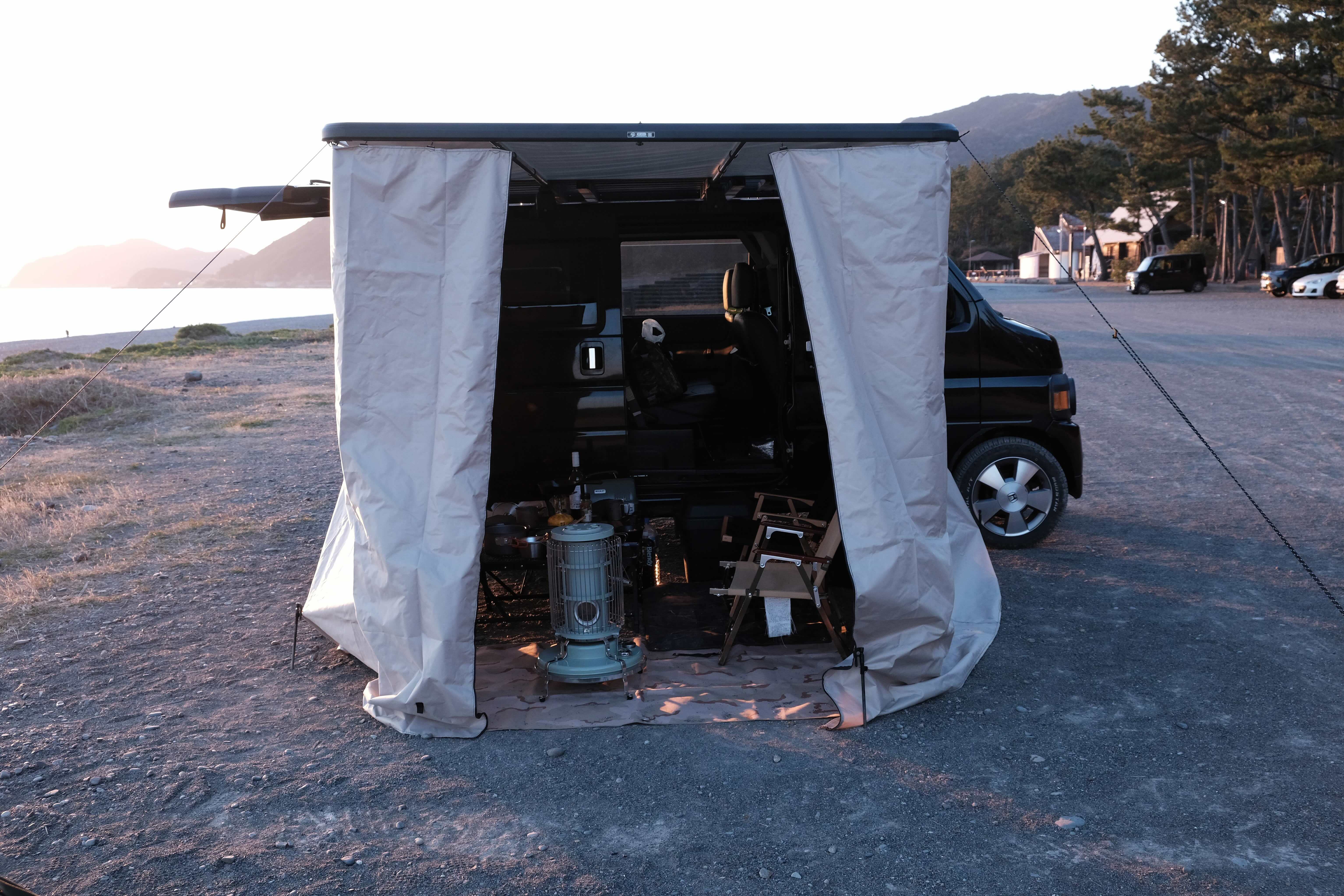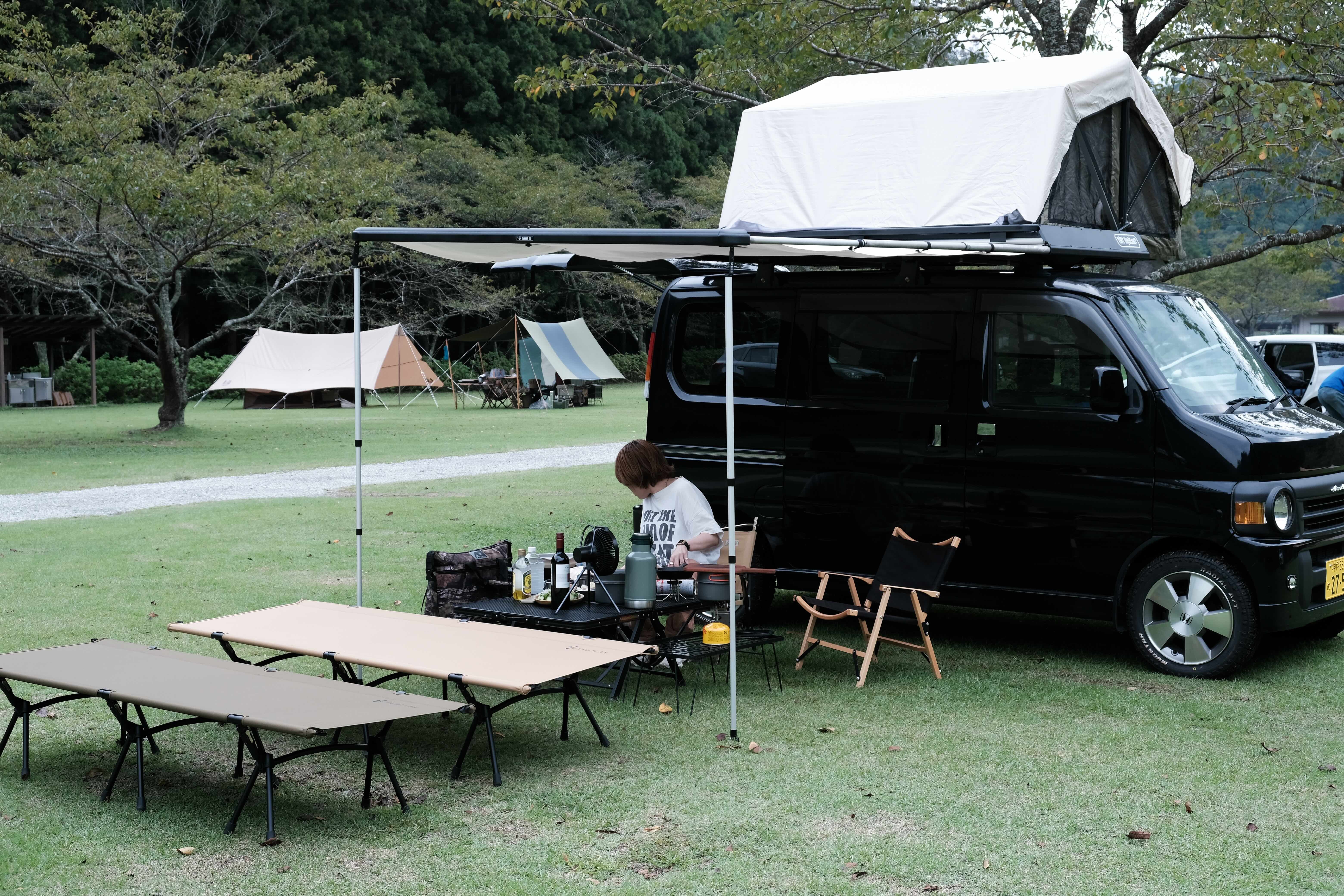 サイドフレームに内蔵されたサイドオーニングはワンタッチで設営可能。サイドオーニングが収納されているとは思えないミニマルな見た目も特徴です。アウトドアのたびにタープやシェードを積み込む必要がなく、気軽に車中泊やキャンプができるようになります。