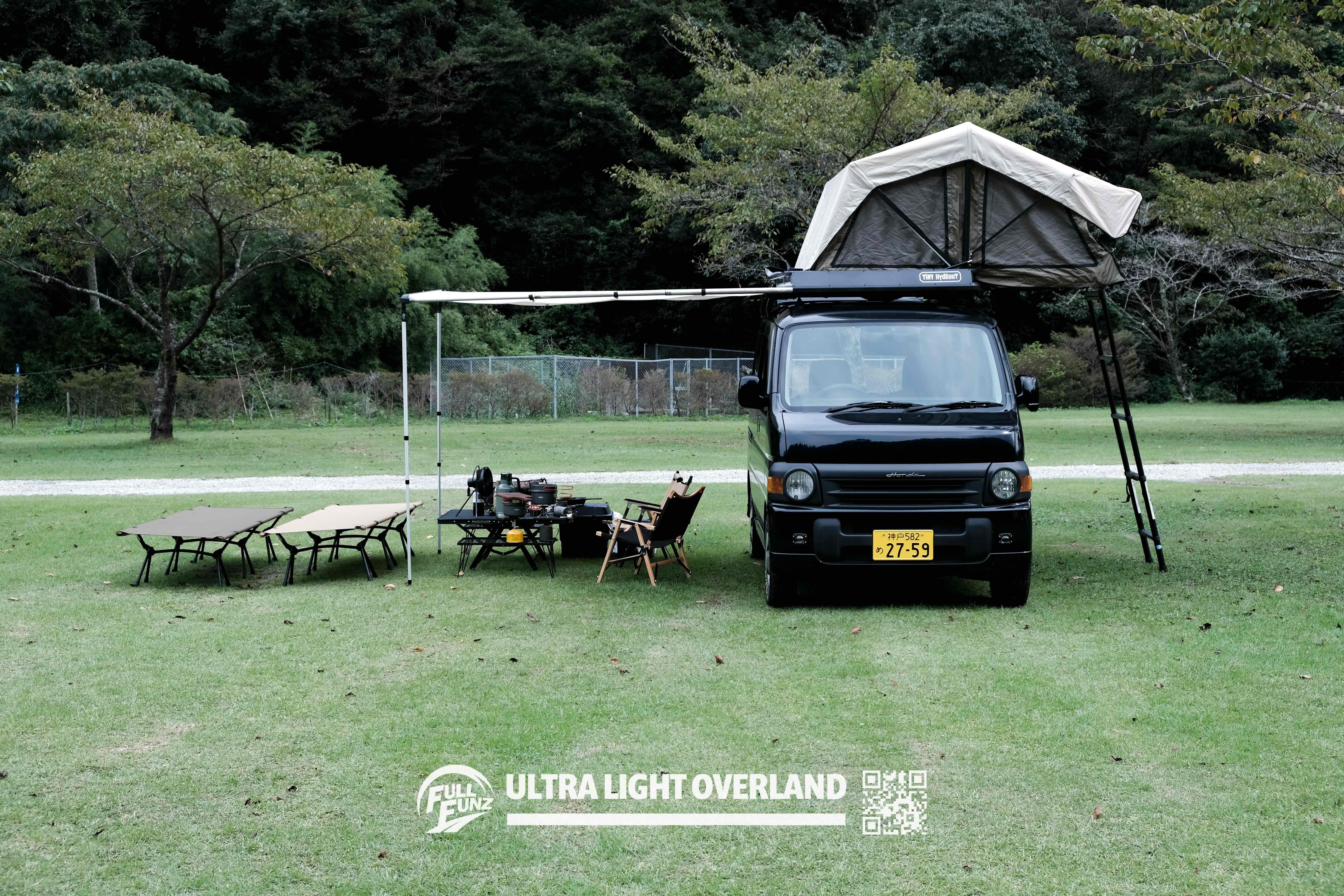 アウトドアスタイルに特化したルーフテント・キャリアなどのギア、カスタムパーツを販売しているFULLFUNZ株式会社(本社:兵庫県猪名川町、代表取締役:宮下 純)は、「ミニマルスタイルなのに全部入り」の画期的なルーフラック「TiNY HydEouT(タイニーハイドアウト)」を販売しています。このたび待望の新機種「TiNY HydEouT “FOLD”」を販売開始しました。