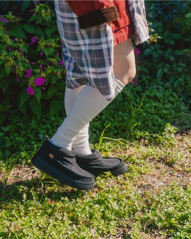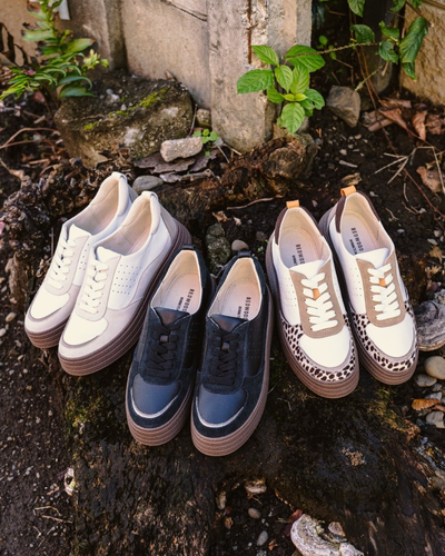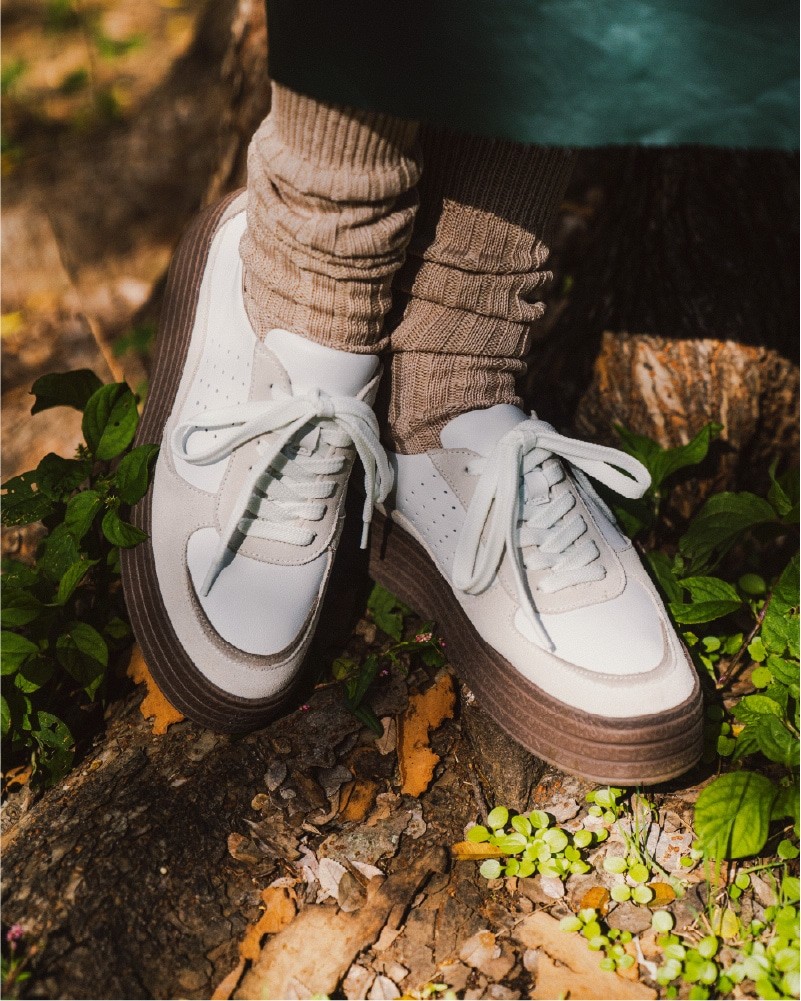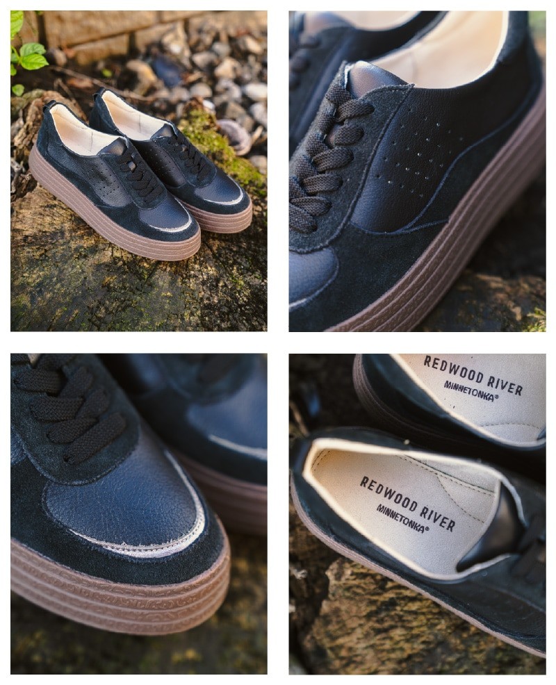 トレンド感のあるデザインに、MINNETONKAの個性を表現する素材のコントラストと、ステッチワークを施したハイブリッドモデル。日常使いしやすいクリーンなルックスと、厚底ソールのクッション性により、長時間のお出かけにも快適に対応します。