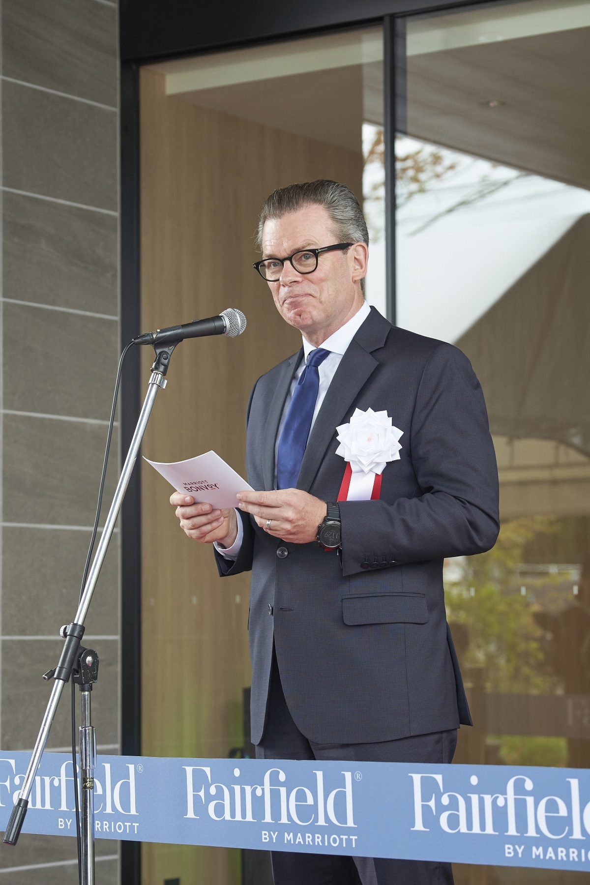 そしてこのホテルに隣接をいたします、道の駅うきはは、今申しましたような地元でとれた新鮮な旬の野菜や果物が本当にお手ごろな値段でお買い求めいただける。そしてまたこういった食材を使ったおいしい食事も楽しんでいただける。福岡県として、うきは市、久留米市、朝倉市をヘルス&ビューティーのゾーンという観光のゾーンに位置づけまして、20余りのヘルス&ビューティーに関する体験メニューを整えて、たくさんのお客様をうきは市、久留米市、朝倉市エリアに呼び込んでいきたいと思っております。このような地域に立地するフェアフィールド・バイ・マリオット・福岡うきはは、宿泊特化型のホテルということでありますので、宿泊客の皆様方には周辺施設を巡っていただくだけでなく、地域の飲食店もご利用いただいておいしい食事を楽しんでいただきたいと思います。こういった点からうきは市はもとより、周辺地域に及ぼす経済波及効果は非常に大きなものがあると期待しているところでございます。また、世界にホテルを展開されているマリオット・インターナショナル、このマリオットが運営されているホテルになりますので、インバウンドの皆さんもぜひマリオットの力でたくさんうきは市に呼び込んでいただけるものと心より期待をしております。