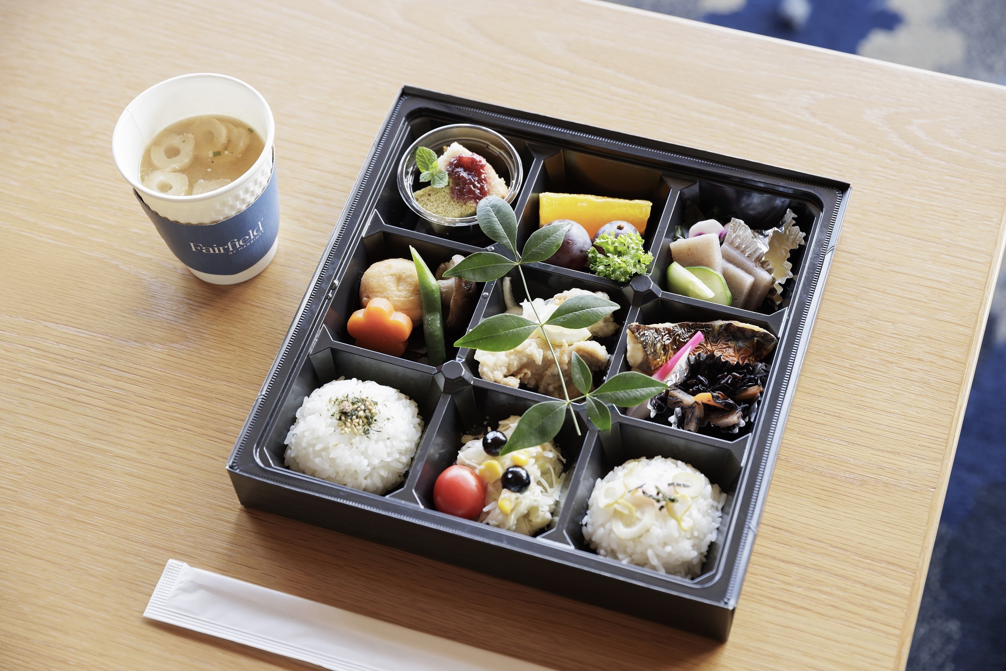 当ホテルは、宿泊特化型ホテルです。食事やお土産などは道の駅をはじめとする地域のお店を利用していただくことで、地域の人々との交流や道の駅との往来を促す設計となっています。朝食は、地域の特産品や名物料理を使用した「朝食ボックス」をご用意しております。