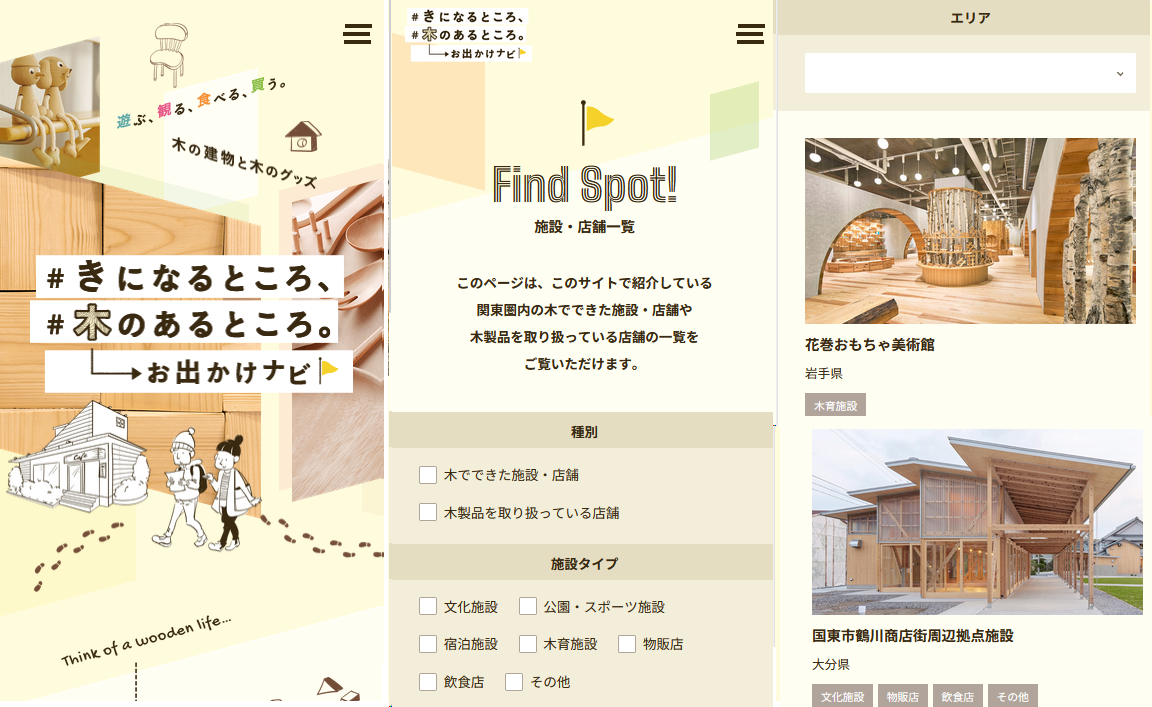 「お出かけナビ」では、全国にある木材を構造や内装などに使った施設・店舗や木製品を取り扱っている店舗を紹介しています。お散歩デートやショッピング、お子様とのお出かけ時のガイドとしてご利用ください。SNSやメールマガジンでも掲載施設を紹介しています。