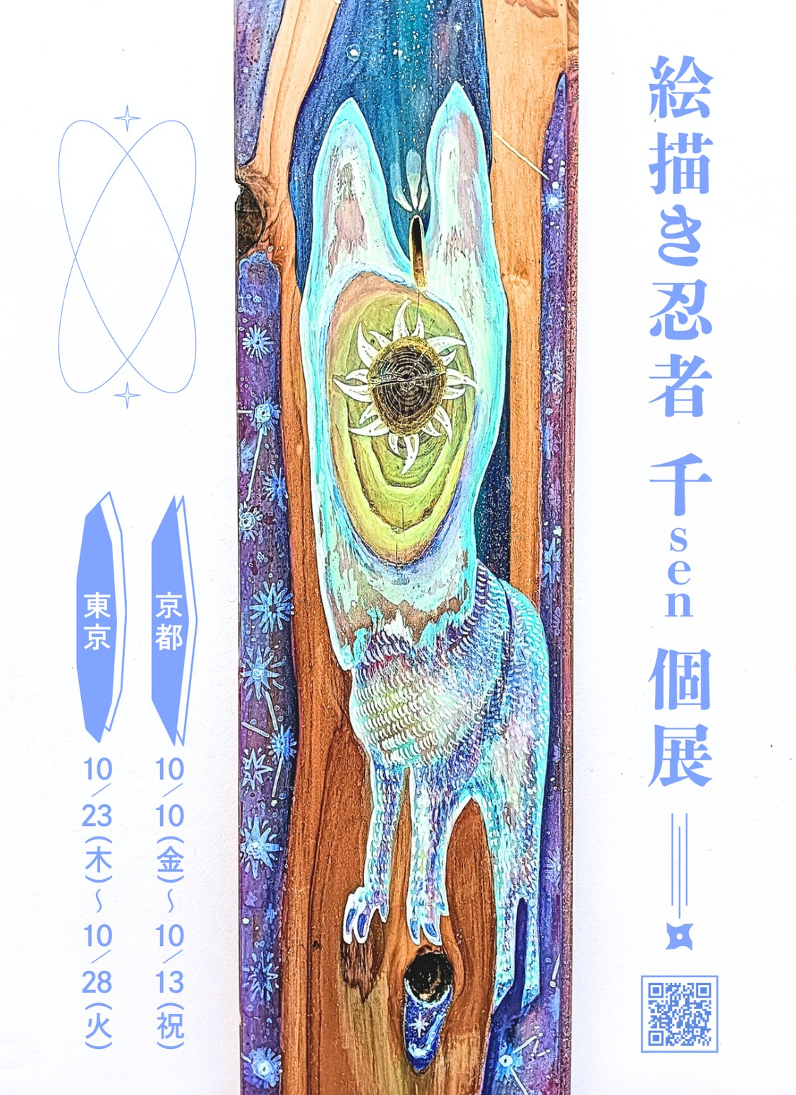 人も自然も癒すアーティスト絵描き忍者千senが、林業に携わる株式会社あしがら森の会議と連携して制作するSDGsアートの個展をこの秋、東京と京都で開催します。虫食いゆえの個性により製品になりにくいとされた木材独特の模様から、八百万の生命達の姿を描き起こし、掛け軸型の絵として仕上げた作品たちは、人と森を繋ぐアートの可能性を訴えます。