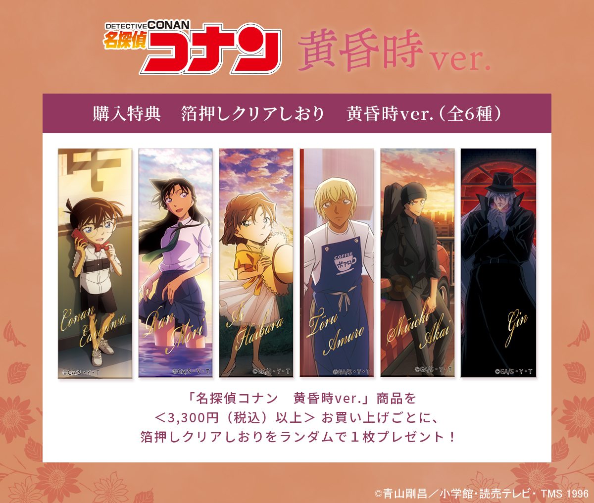 トムスショップにて「名探偵コナン 黄昏時ver.」関連商品を税込3,300円以上お買い上げごとに「箔押しクリアしおり」をランダムで1枚プレゼント!
