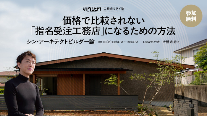 10月に開講する『シン・アーキテクトビルダー塾』に先立ち、塾長を務める大橋利紀氏(Livearth×OhashiArchitects)が登壇し、「設計の力」が経営にもたらす価値と、地域で長く信頼され続ける工務店になるための本質について語ります。