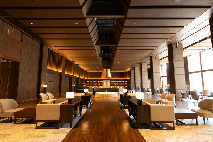 ロビーの吹き抜けと山河を望む絶景を活かし「壮大な別荘の書斎」をテーマに新設されたプレミアムラウンジは、開放感もあり宿で過ごす時間への期待感を高めます。プレミアムラウンジではアルコールを含むドリンクを無料でご用意しております。ご到着時や湯上りなど、お好きなタイミングでお楽しみください。 また、暖炉も設えているので、昼夜で異なる雰囲気を楽しめるのも魅力のひとつです。