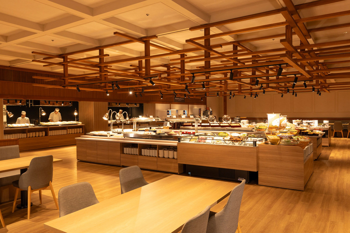 バイキング会場であるレストランの内装は、通路はやぐら組を活かした和モダンな雰囲気。ディナーバイキングでは網焼き牛タンなどのご当地グルメのほか、定番料理から季節の料理、ハーゲンダッツ アイスクリームなどのデザートまで、年齢問わず好まれる豊富なメニューをご用意しております。もちろん、ライブキッチンからご提供する出来たて熱々の美味しさもご堪能いただけます。旅の醍醐味のひとつである「食事」を思う存分お楽しみください。