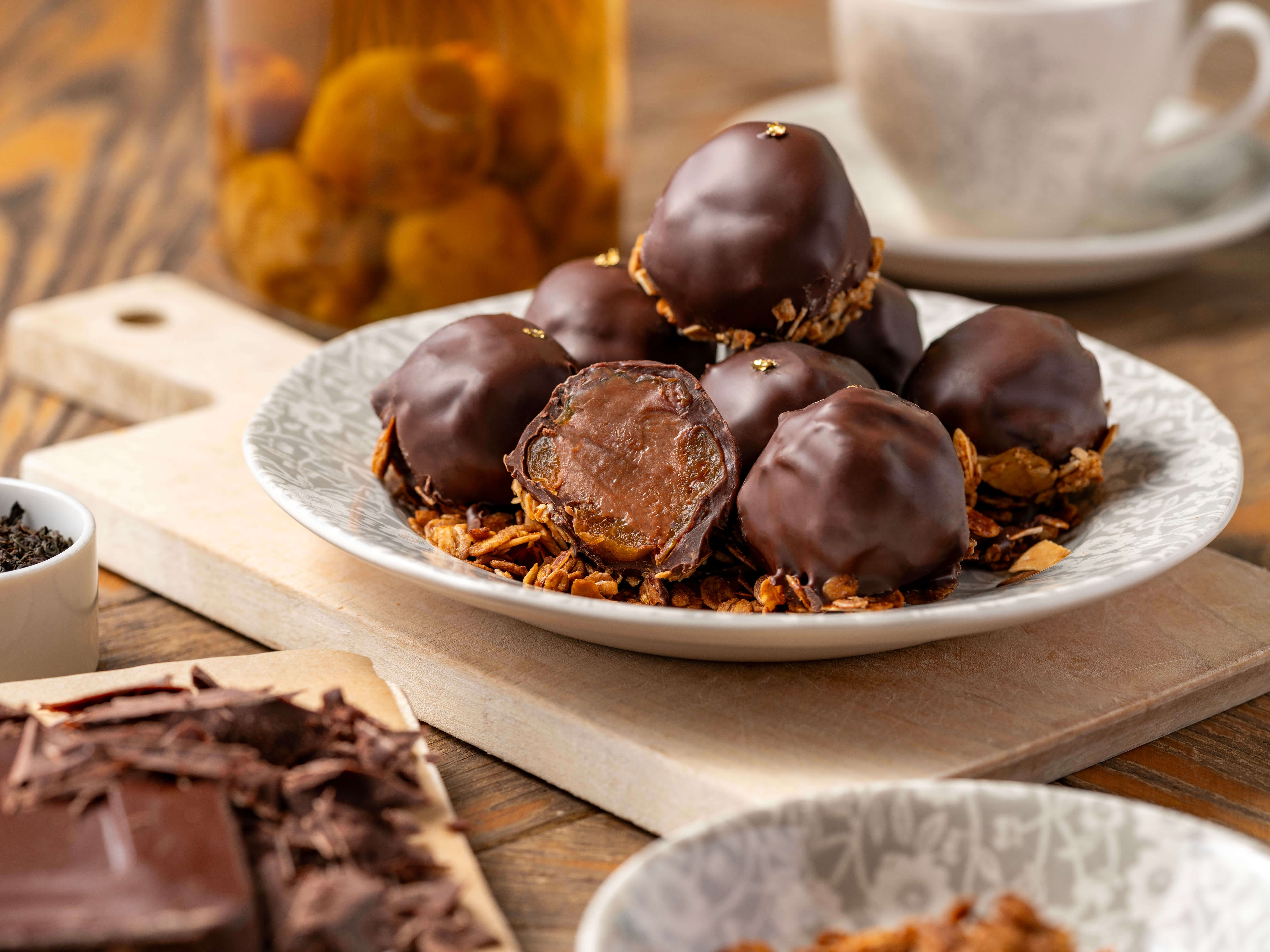 「全国梅酒品評会2024金賞」を受賞した「原酒梅酒」の梅酒を作る際に使用した完熟南高梅の種を丁寧に取り除き、アールグレイが香るミルクガナッシュをたっぷり詰めました。さらに、エクアドル産カカオ65%のチョコレートでコーティングし、自家製グラノーラを食感のアクセントに加えて、上質な味わいに仕上げました。