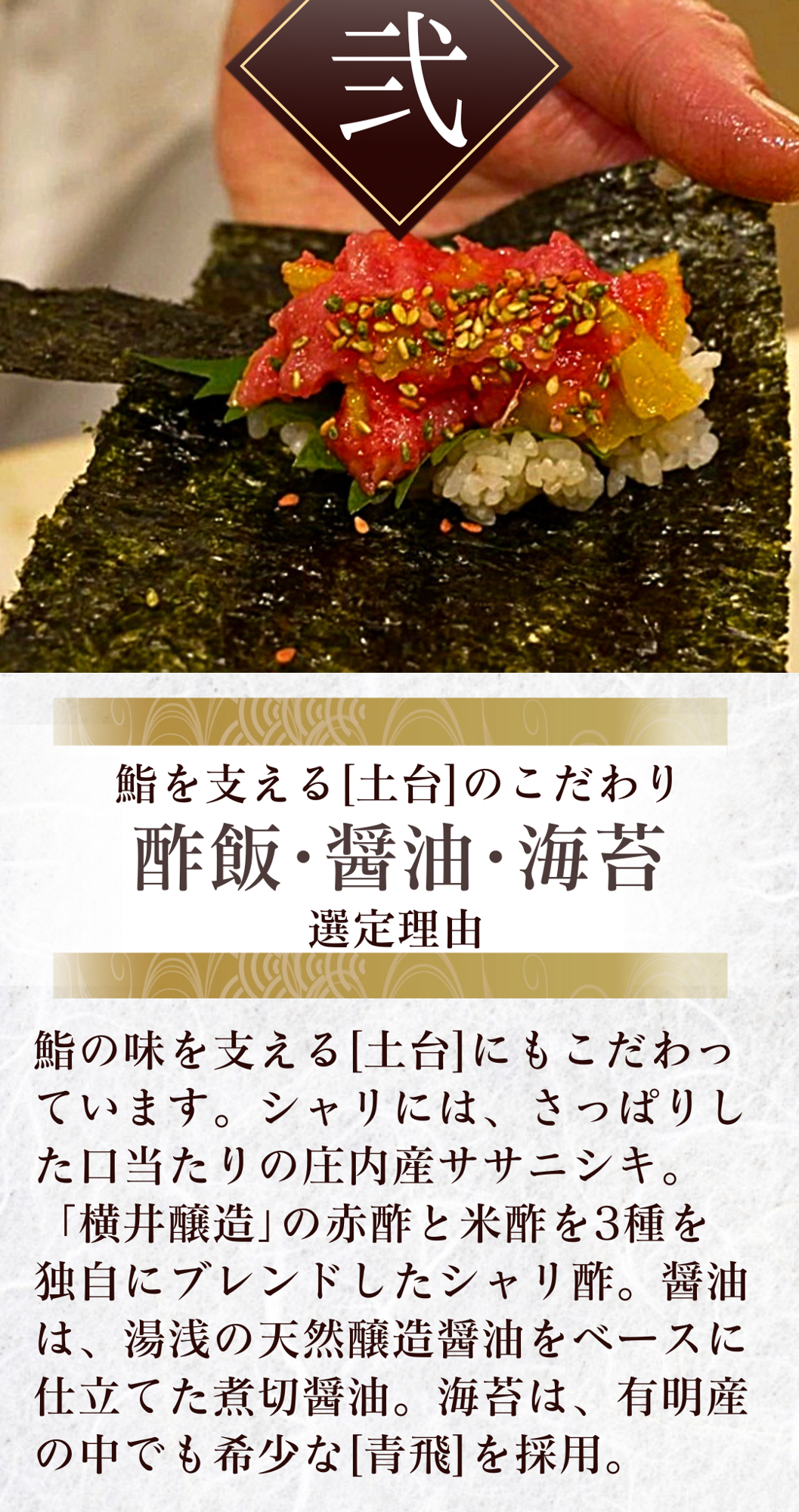 酢飯には庄内産ササニシキと横井醸造の赤酢・米酢を独自ブレンド。湯浅の天然醤油と有明産「青飛」海苔を使用し、素材の香りを引き立てます。