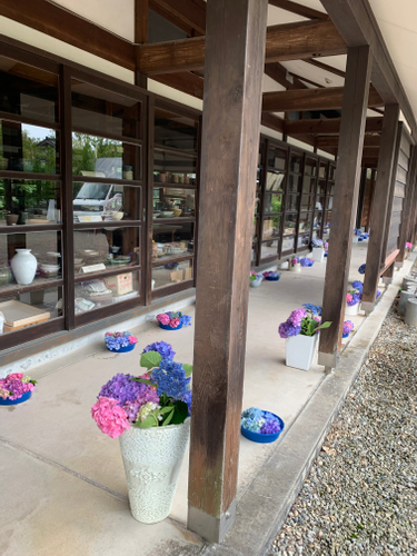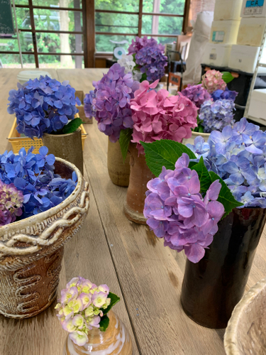 来年再び美しい花を咲かせるために必要なプロセスとはいえ、まだまだ美しく咲いているあじさいたち。JFCではそんなあじさいたちにもう一度輝ける場所をつくりたい、あじさいの美しい姿を少しでも多くの方に見ていただきたいとの想いから、あじさいの剪定作業に参加させていただき、刈り取った約500本のあじさいをJFCが管理運営する射水市陶房「匠の里」に飾りました。工房で製作された花器も使用し、陶芸工房の通路両脇をはじめ工房内各所にあじさいの花が咲き、自然に囲まれた閑静な佇まいの「匠の里」が華やかに彩られました。