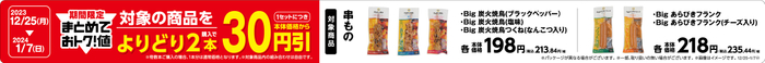 レンジで温めてお手軽にお楽しみいただける、焼鳥やフランクフルト等の串もの商品を、よりどり2本購入いただくと、1セットにつき、本体価格から30円引きでお得にお買い求めいただけます。(冷蔵ケースにて販売しております。パッケージが異なる場合がございます。)