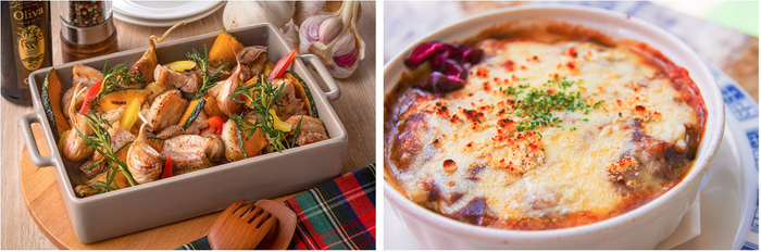 左:肉質のきめが細かく柔らかで、上質な脂ならではの甘さも感じる山梨県産の富士桜ポークのオーブン焼き。肉汁の旨味が染み込んだ野菜も一緒にお楽しみください。