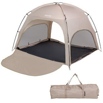 シーンに合わせて「オープン・メッシュ・クローズ」の3通りに切り替え可能。前後のドアに加え、窓も付いているため風通しは抜群です。フルオープンにすれば視界を遮るものがなく、シェード内にいながら最高の見晴らしを楽しめます。またドア部分を地面に広げればフロアの延長シートとなり、足を延ばしてくつろぐことも可能です。