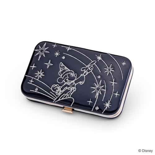 パール感のあるダークネイビーにシルバーの刺繍を施した、クールな印象のトラベルジュエリーケース。魔法使いの弟子に扮したミッキーマウスが夜空の星たちを指揮するシーンを描いた、ケイウノオリジナルデザインです。ケースの中身はスエード調のやわらかな布地を使用。高級感のあるダークネイビーにジュエリーがよく映えます。ネックレス・リング・ピアスなどが収納できます。手のひらにおさまるミニサイズ。年代を問わず使いやすい落ち着いた色味です。専用ケース入りなので贈り物にも。