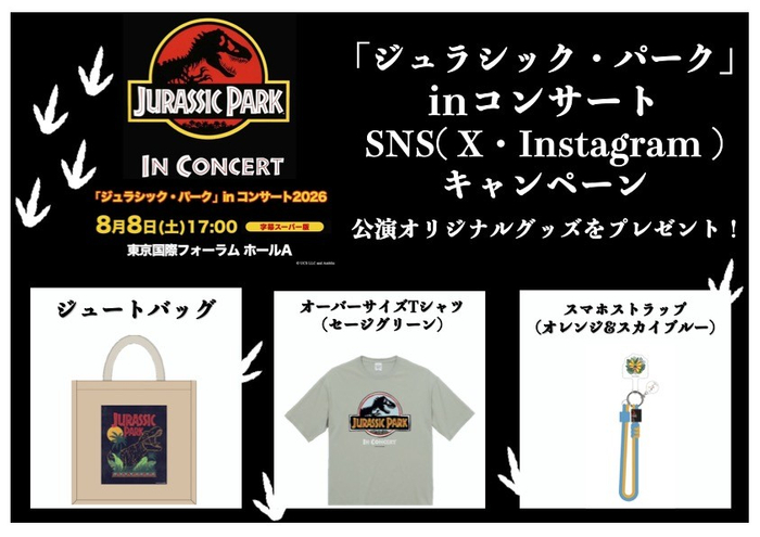 “ジュラシック・シリーズ”の記録的大ヒット映画『ジュラシック・パーク』の映画全編を大スクリーンで上映し、舞台上の80名超のフルオーケストラが音楽部分を映画に合わせて生演奏するシネマオーケストラ(通称:シネオケ ®)*1が8月8日、東京国際フォーラムホールAで開催されることを記念し、抽選で「ジュラシック・パーク」inコンサートのオリジナルグッズが当たるSNSキャンペーンを開催します。