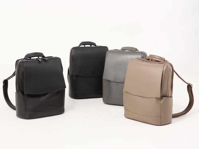 商品は、軽量で雨の日でも安心な合皮素材を採用したシンプルなスクエア型で、訪問先でのカジュアルな印象や電車通勤の際の前持ちを解消するため、トートバッグとしても持てる2WAY仕様としました。カラーは、ブラックに加え要望の多かったモカ・グレーを作成。ブラックは、ナイロン×合皮素材のミックスも追加しました。また、クッション性のあるPCポケットはもちろん、肩への負担を軽減する少し太めのショルダーやバッグを開けずに取り出せる名刺入れポケットを設置するなど工夫を施しています。その他、単体でも持ち運びができ、スマホやメイク道具などを収納できるバッグインバッグを付属するなど、こだわりの詰まったアイテムに仕上がっています。