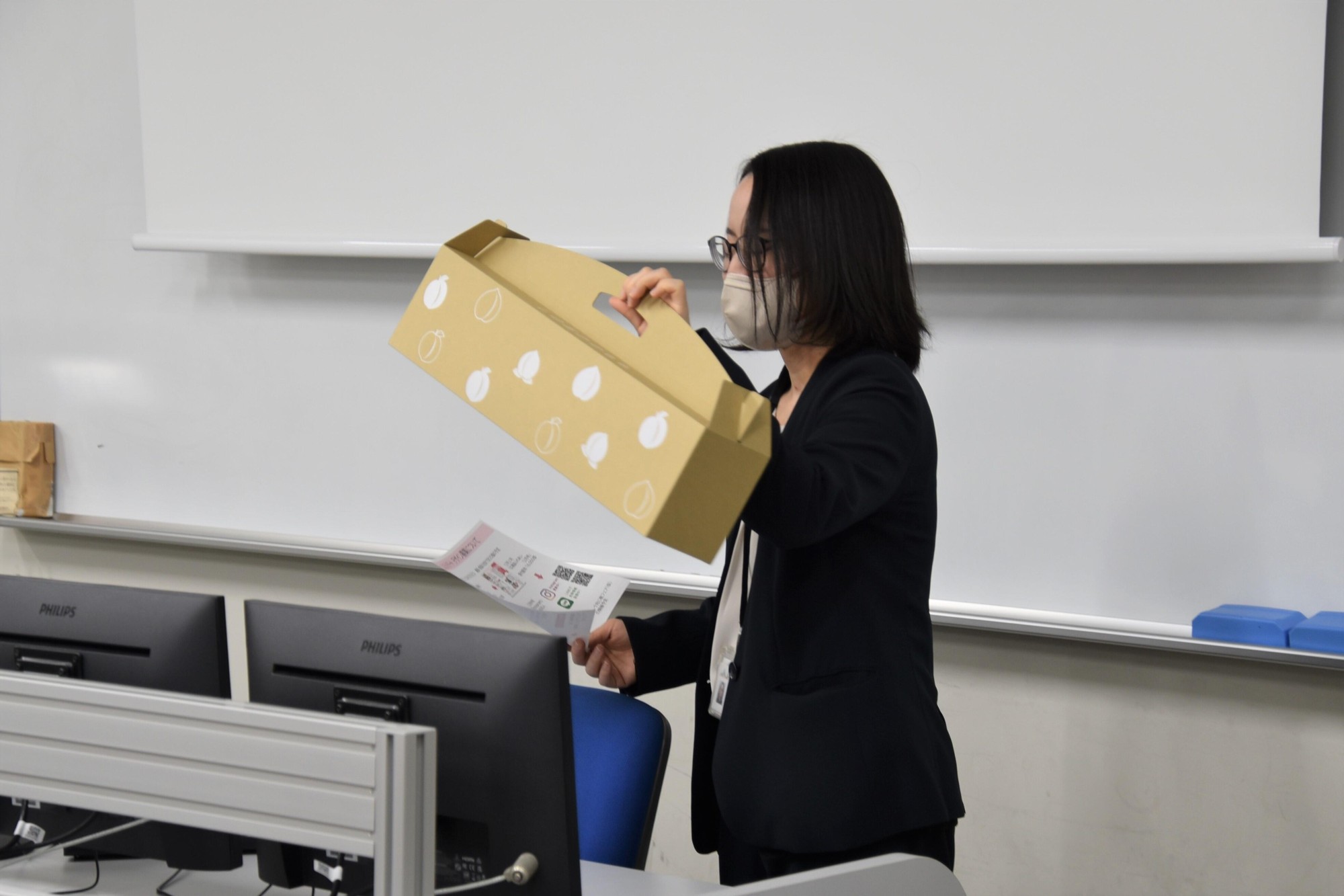 このうち、「YouTube Short」の活用案を提案した班は、調査したデータから果樹の摂取量が少なく、健康や美容を気にする20~30代をターゲットに選び、桃の効果を伝えるアニメを作成し、30秒~1分の短尺動画「YouTube Short」でアピールするアイデアを提示しました。また、パッケージの再利用を提案した班は、「箱を日常的に見ることで身近に感じてもらえる」として、菓子や文房具などの収納に使ったり、箱を切り取ってポストカードやギフトボックスに活用したりするアイデアを紹介しました。