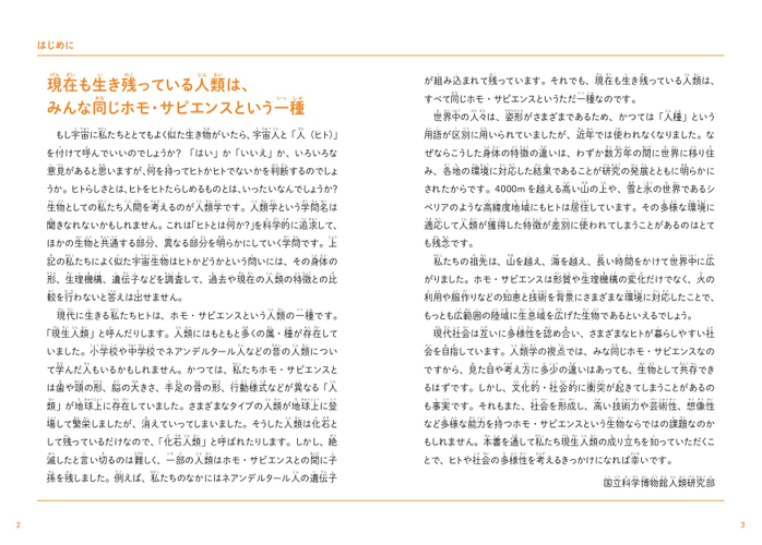 現代社会は互いに多様性を認め合い、さまざまなヒトが暮らしやすい社会を目指しています。人類学の視点では、みな同じホモ・サピエンスなのですから、見た目や考え方に多少の違いはあっても、生物として共存できるはずです。しかし、文化的・社会的に衝突が起きてしまうことがあるのも事実です。それもまた、社会を形成し、高い技術力や芸術性、想像性など多様な能力を持つホモ・サピエンスという生物ならではの課題なのかもしれません。本書を通して私たち現生人類の成り立ちを知っていただくことで、ヒトや社会の多様性を考えるきっかけになれば幸いです。