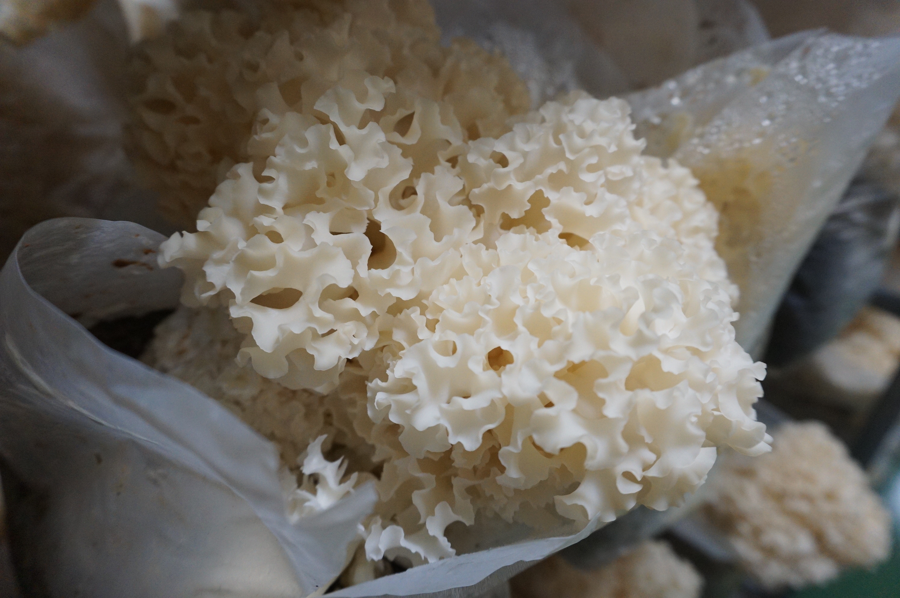 ハナビラタケは、初秋の標高1,000m以上の高山地帯のカラマツ等の針葉樹の株元に葉ボタン状に自生し、30年程前に人工栽培に成功していますが、これまで天然や菌床栽培の流通量は極めて低いことから“幻のきのこ”とも呼ばれ、珍重されていました。自然界で採取が難しく、流通量が極めて低いため、幻のきのこと言われていますが、森の環では2020年に量産化に成功。