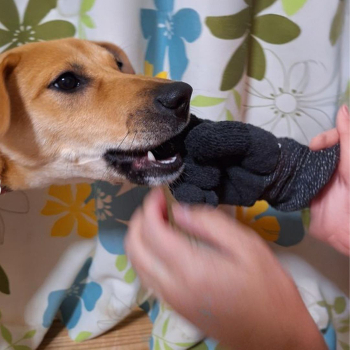 手首部分を長めに設計しているため、動物の口へ手を持って行く際の恐怖心をやわらげます。また、手から外れにくく、誤飲対策の役割も担っています。
