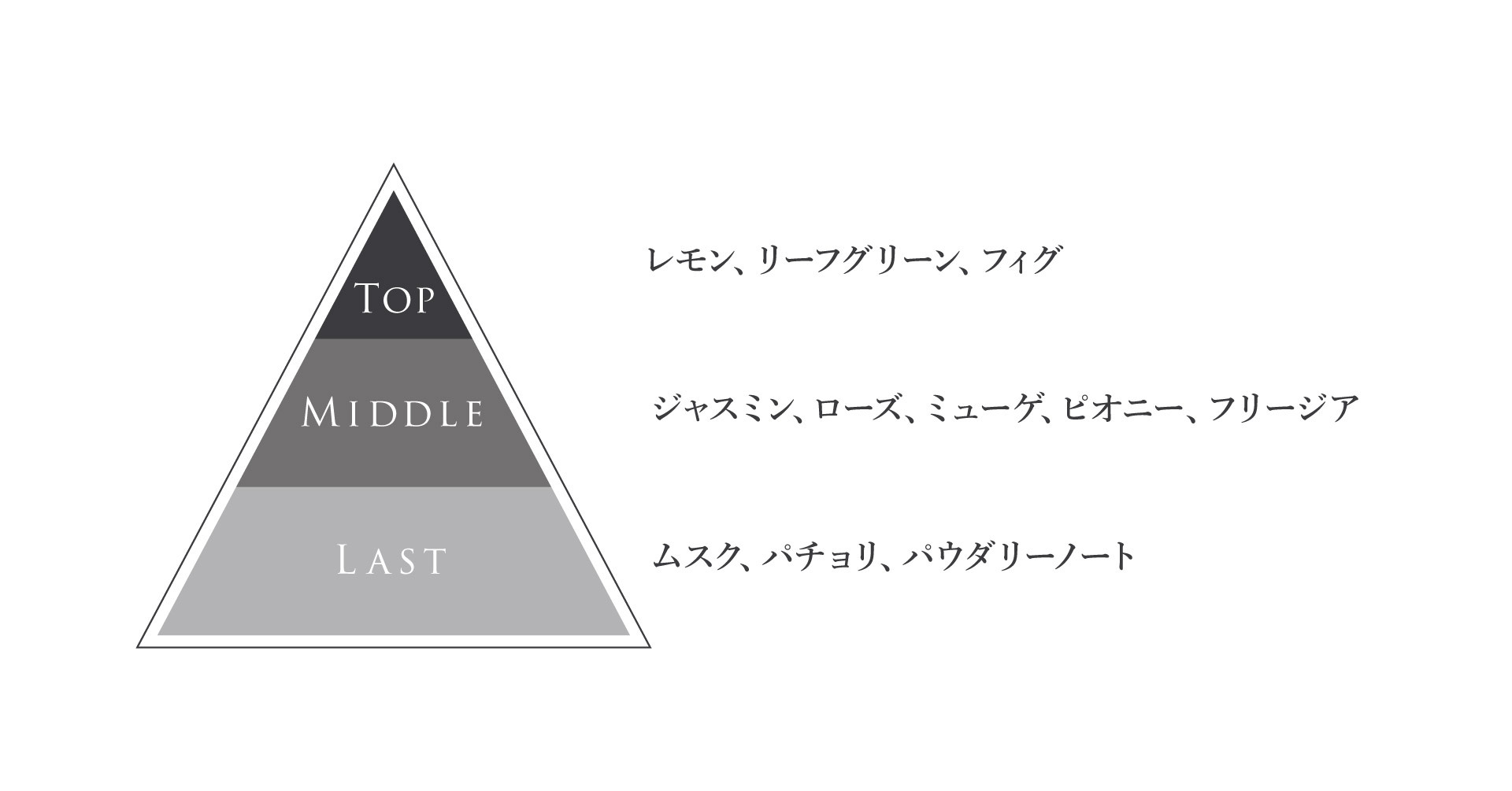 ラストノート:ムスク、パチョリ、パウダリーノート