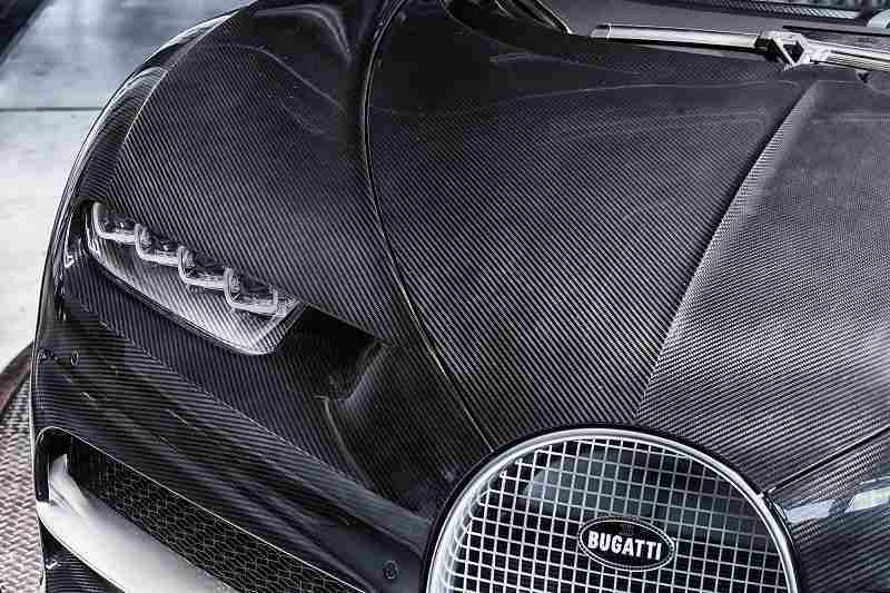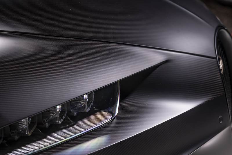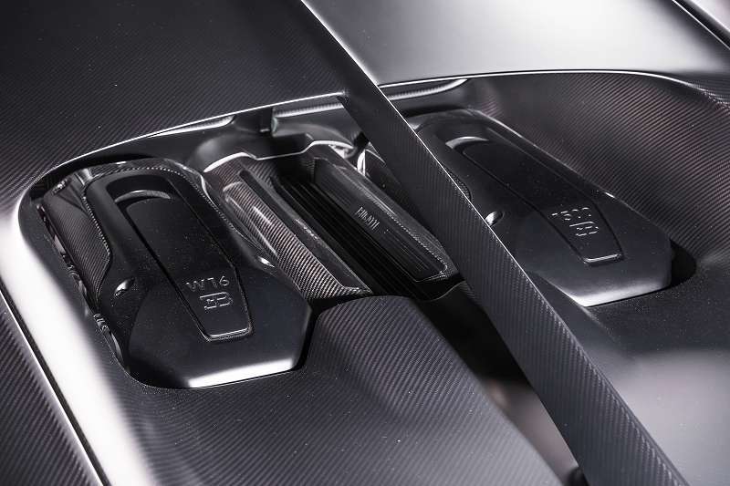 「シロン ノワール エレガンス」は、ボディの大部分にブラックカーボンファイバーパーツを採用しています。ラジエターグリルの純銀製ブガッティ“マカロン”エンブレムには、この限定車専用のブラックエナメルが「ノワール=漆黒」の象徴としてあしらわれています。