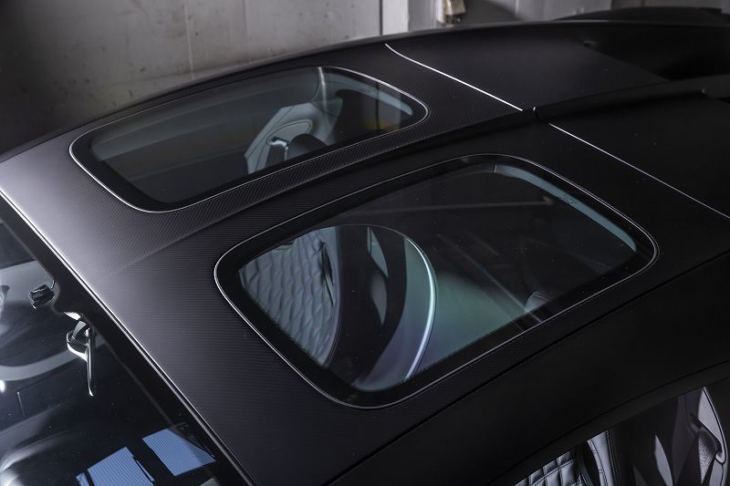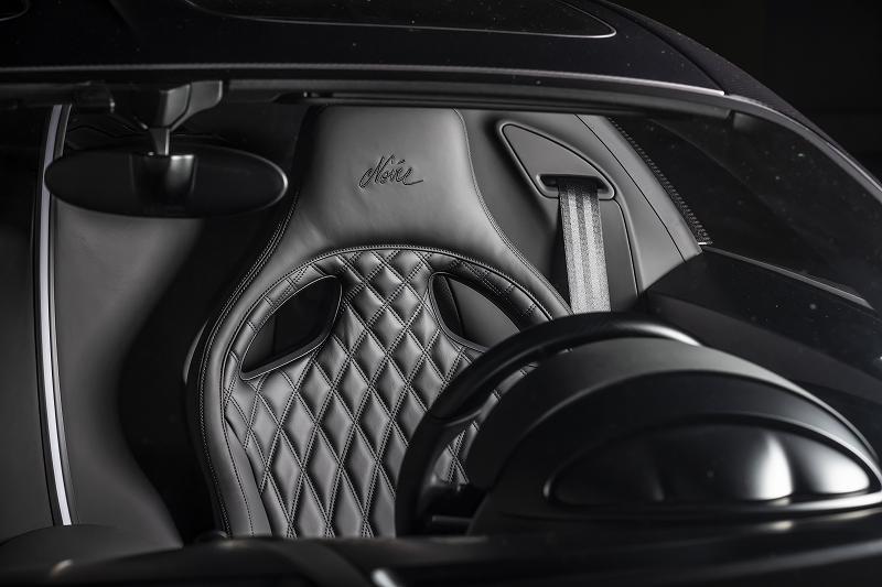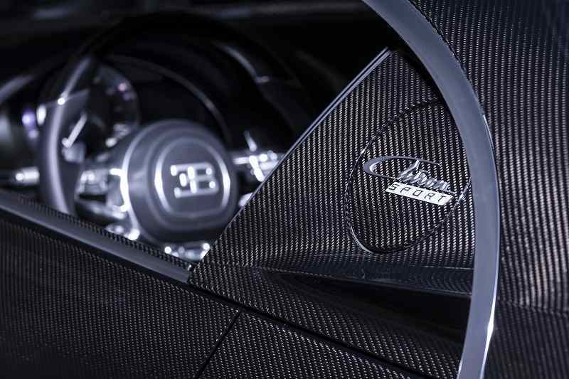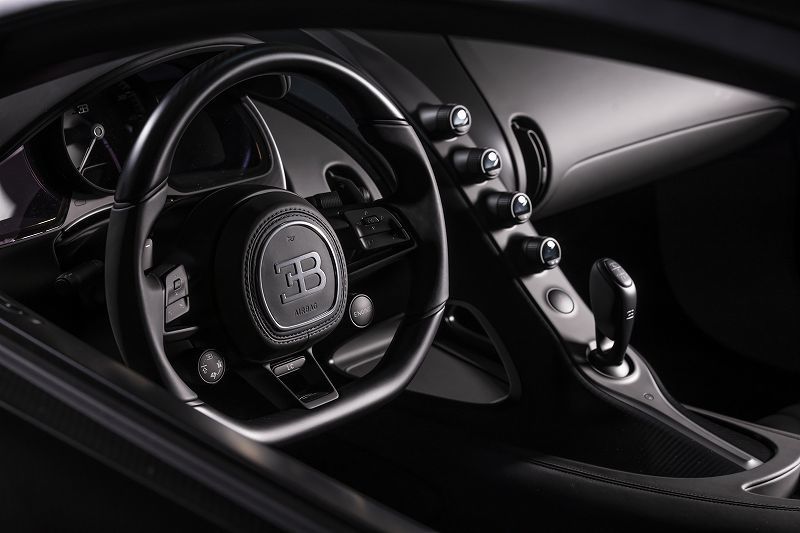 「シロン ノワール スポルティブ」は、マットブラック仕上げのカーボンファイバーボディ。ボディサイドのC字型ブガッティシグネチャーライン、ホイール、フロントスポイラー、ラジエターグリルが、すべてマットブラックに統一されています。