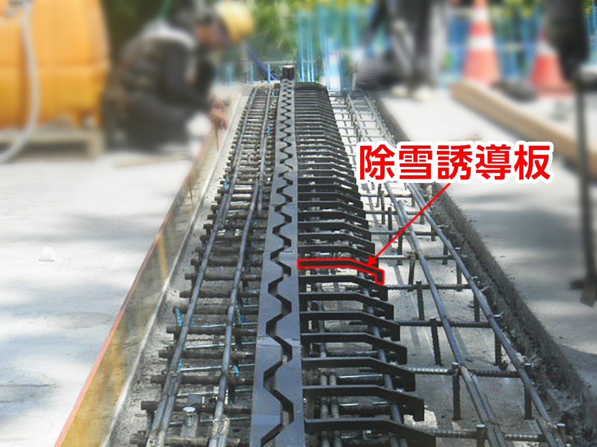 そして、除雪車の刃が伸縮装置に引っかかることを防ぐため、「除雪誘導板」も標準装備。製品本体を守るだけではなく、除雪作業時の安全性にも配慮しています。積雪地域では必須の仕様です。