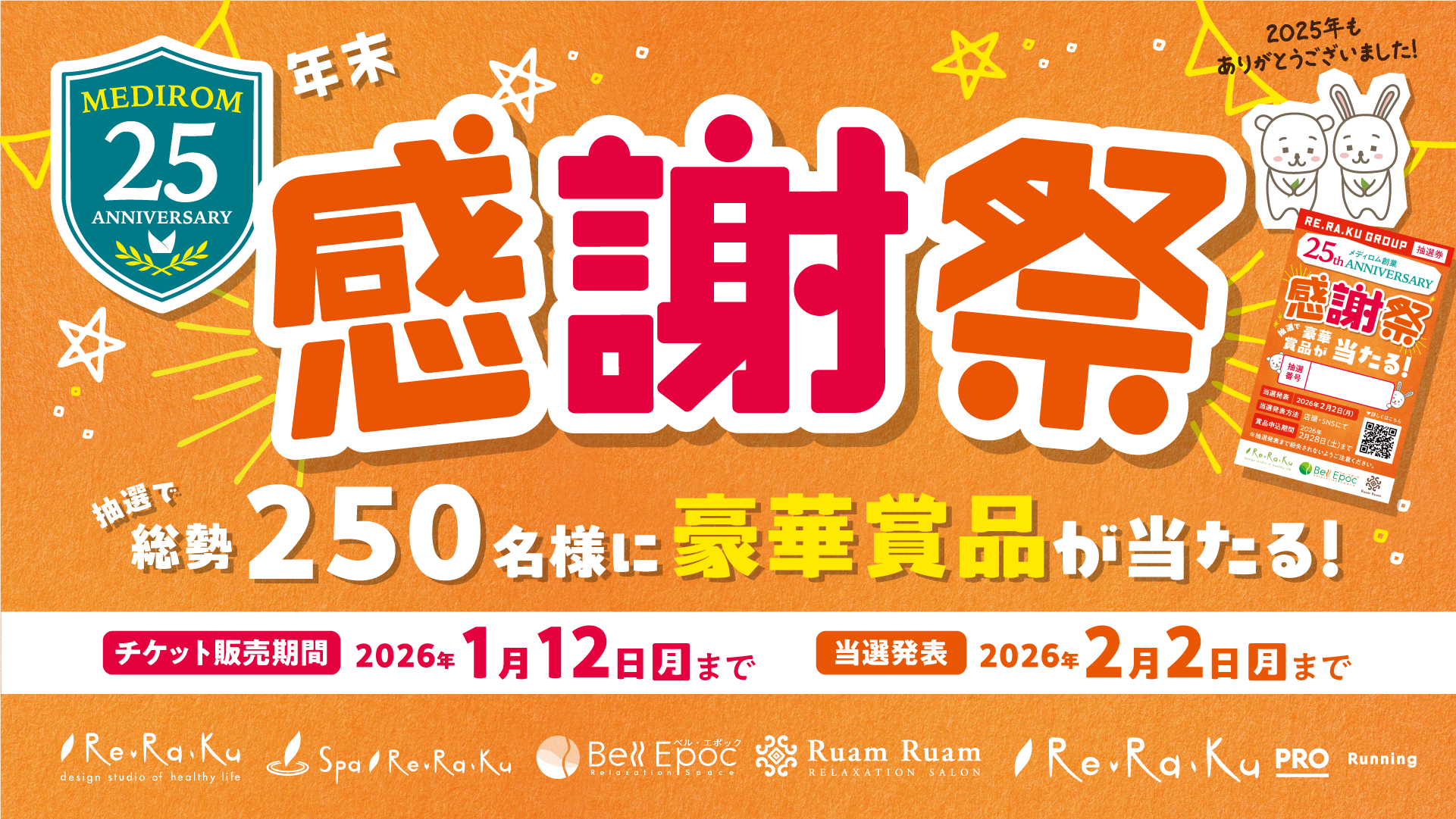 株式会社メディロム・ウェルネス(本社:東京都港区、代表取締役:江口 康二)は、日頃より Re.Ra.Ku グループをご愛顧いただいている皆さまへの感謝の気持ちを込めて、2025年12月1日(月)より、総勢250名様に豪華賞品が当たる「2025年 年末感謝祭」を開催いたします。