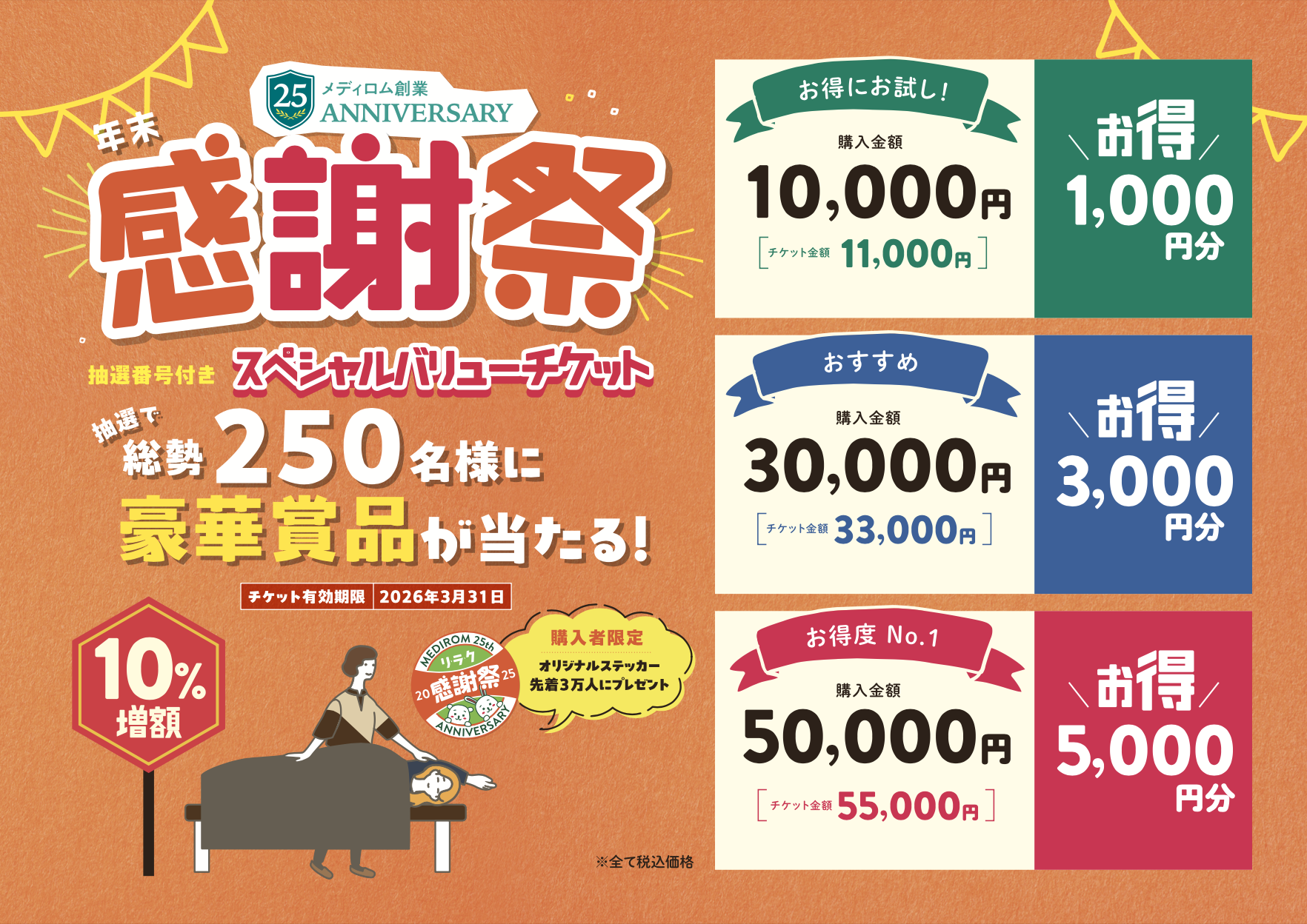 一年を通して当グループをご利用いただいた皆さまに、リラクゼーションを「楽しみ」「体験」「思い出」へと昇華する、新しい形の感謝祭をお届けしてまいります。