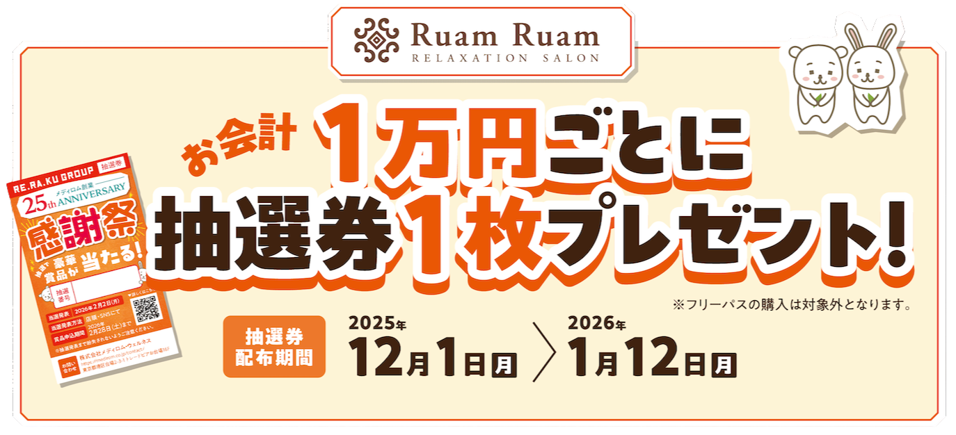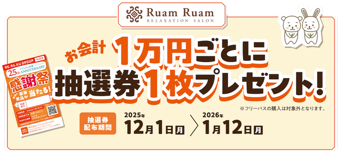 Re.Ra.Ku/Bell Epoc/Spa Re.Ra.Ku/Ruam Ruam/Re.Ra.Ku PRO の各店舗にて、ブランドごとのキャンペーン参加で抽選券を配布します。