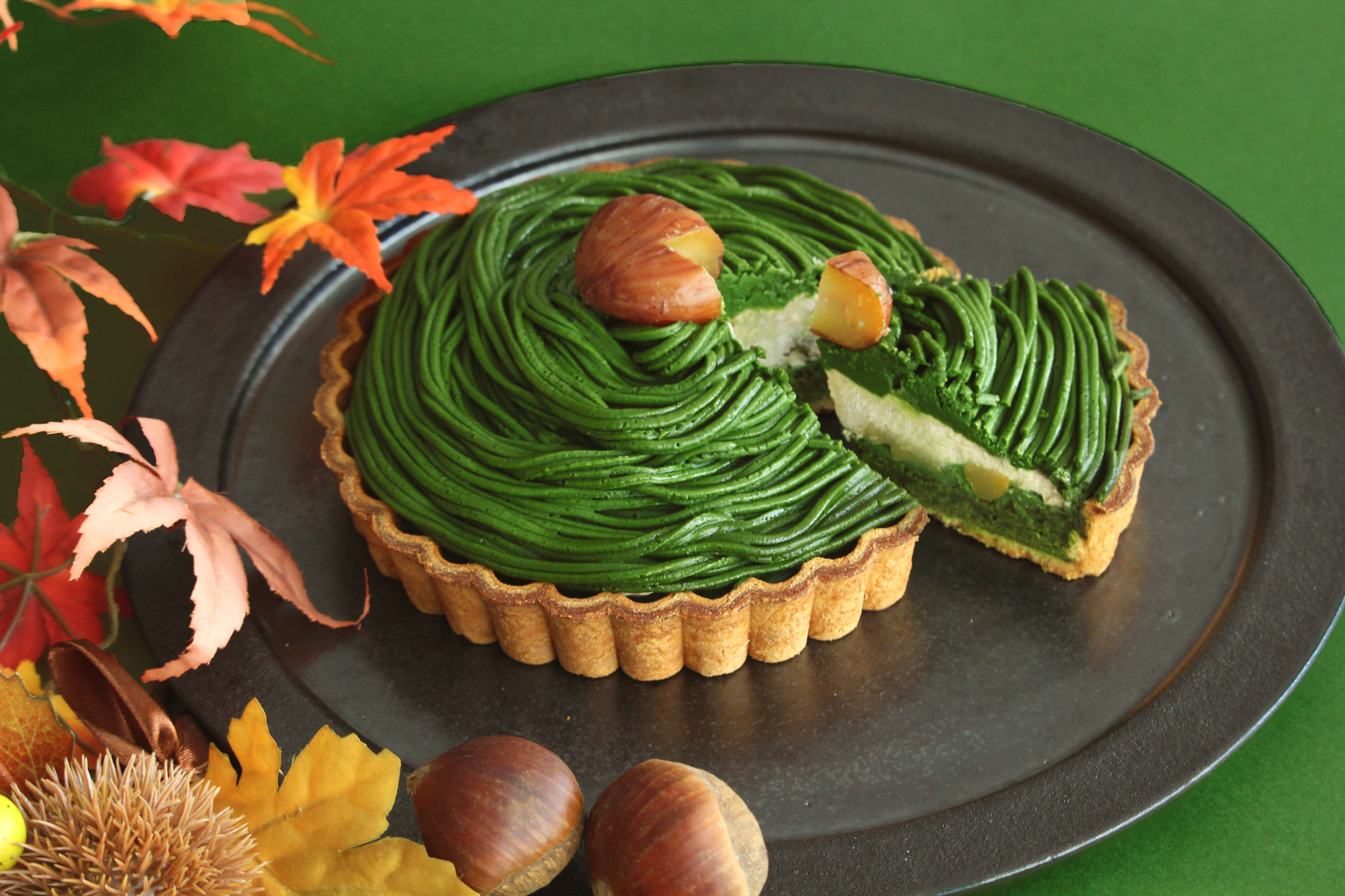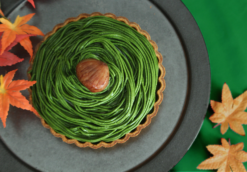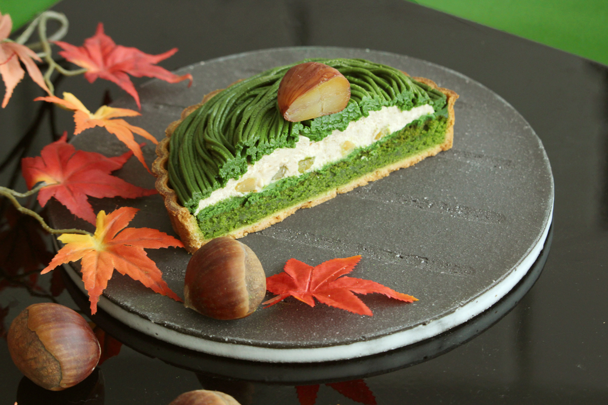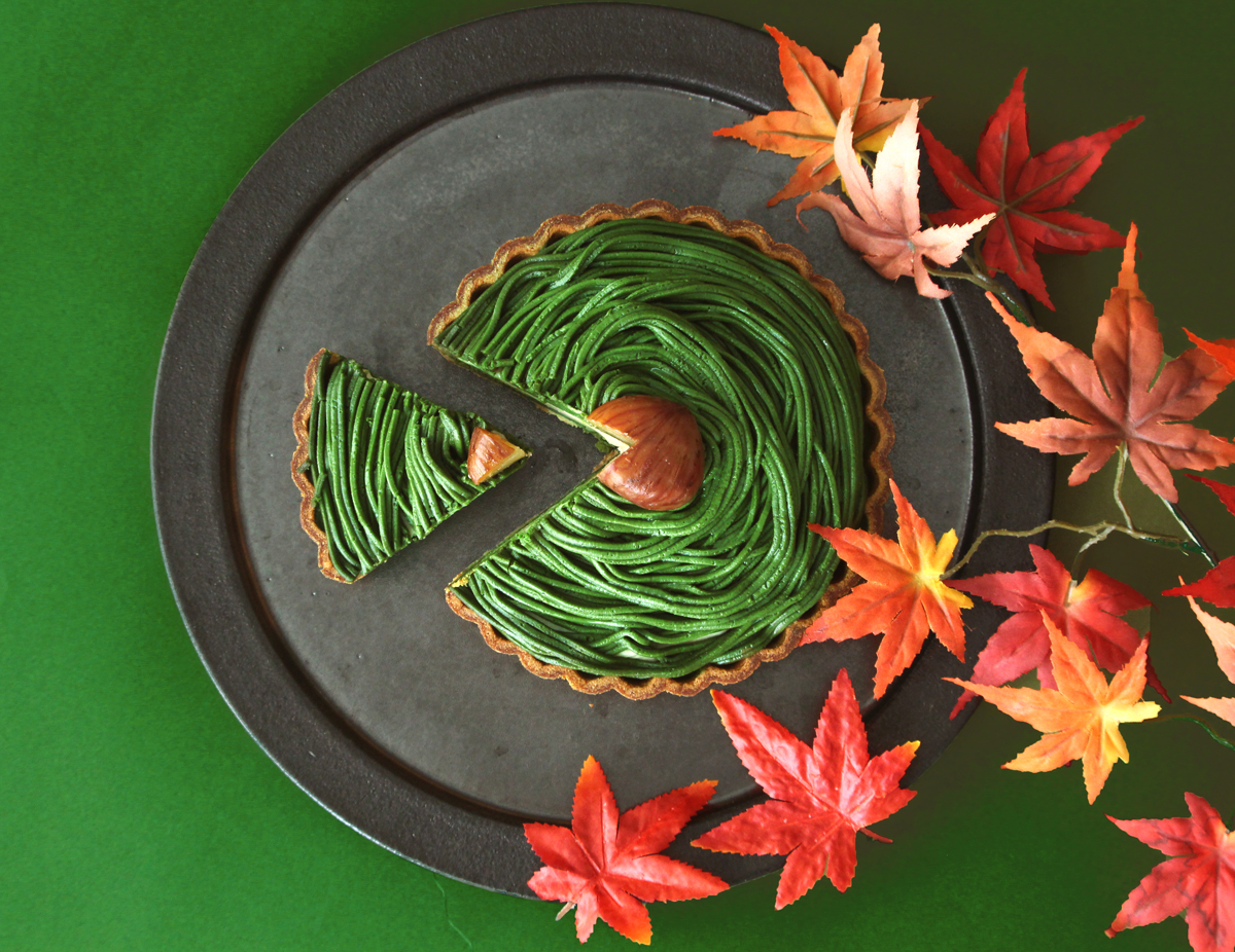 抹茶と栗の風味が調和する繊細なバランスのモンブランクリームで一面を覆いました。見た目も美しい緑色が楽しめます。