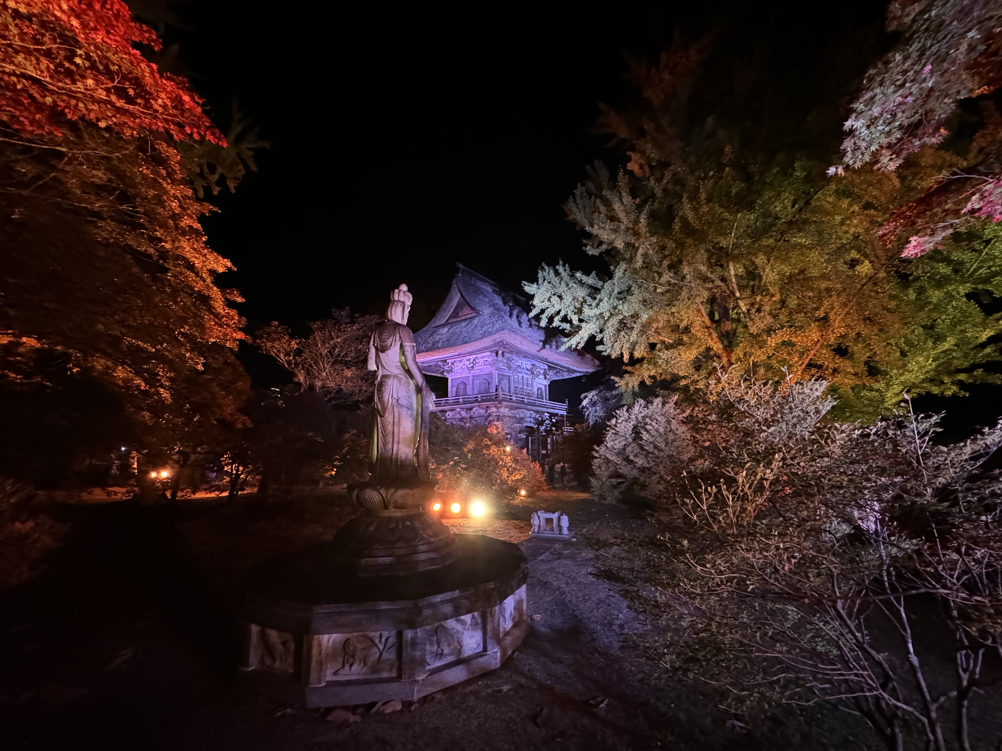 長野県大町市の紅葉スポットとして知られる霊松寺では、2023年11月5日(日)まで紅葉ライトアップを実施しています。このライトアップは、例年、10月下旬から見頃を迎える紅葉に合わせた開催するものです。霊松寺は1404(応永11)年に開かれた、長野県最古の曹洞宗寺院で、県宝の山門や葉の上にギンナンができる「オハツキイチョウ」など、紅葉に彩られた山門や境内が幻想的な雰囲気に包まれたライトアップは毎年好評となっております。