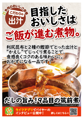 昨年度90万個を売り上げた「筑前煮」。和惣菜の人気No.1商品を、ライフオリジナルの‟だし”と‟かえし”で手間暇かけて調理しました。
