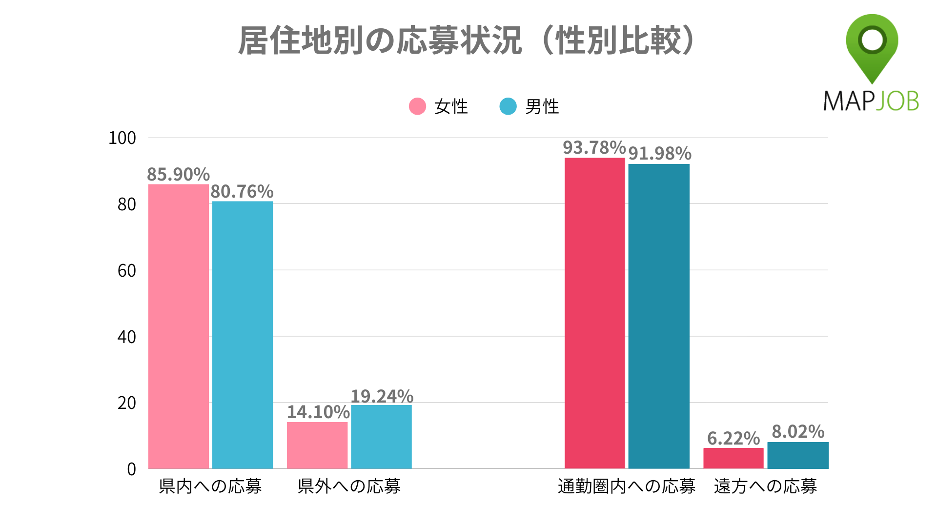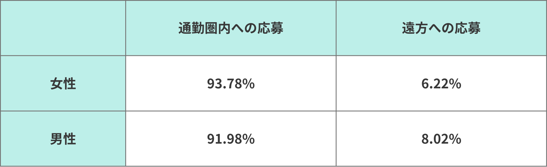 通勤圏内への応募割合は、女性が93.78%、男性が91.98%といずれも9割を超えました。