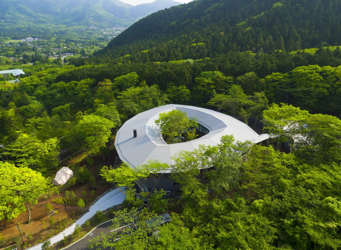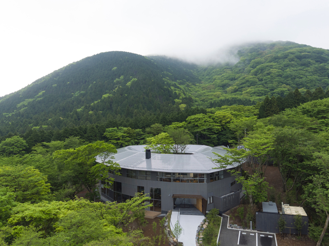 富士箱根伊豆国立公園に位置する箱根仙石原は、秋になると一面が黄金の穂に揺れるすすき草原で知られる自然溢れる高原リゾートです。周辺には多くの美術館やゴルフ場が点在し、山々や芦ノ湖などでの様々なアクティビティにも恵まれたエリアです。設計を手掛けたのは、小田急新型ロマンスカーや箱根登山鉄道の車両デザインをはじめ、「ポンピドゥー・センター」や、「関西国際空港旅客ターミナルビル」「ベルギー大使館」の建築デザインなどにたずさわってきた日本を代表する建築家岡部憲明氏です。