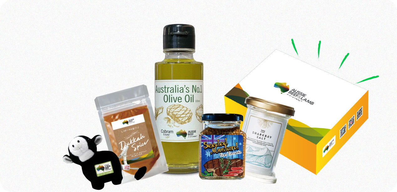 グラスフェッド(牧草飼育)とグレインフェッド(穀物肥育)の味わいの違いを、豪快な厚切りステーキでお楽しみいただける厚切りステーキ食べ比べセットや、オーストラリア産オリーブオイル、粒マスタード、塩、スパイス、オリジナルマスコットがセットになった特別な食材BOXをご用意いたしました。